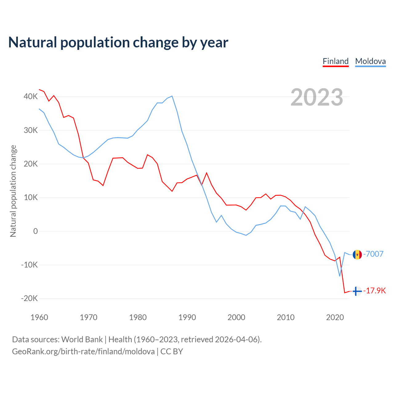 According to the latest available data on birth rates, the fertility rate in Finland was 1.26 children per woman in 2023, compared to 1.73 in Moldova in 2023. The replacement level is considered to be 2.1 children per woman.