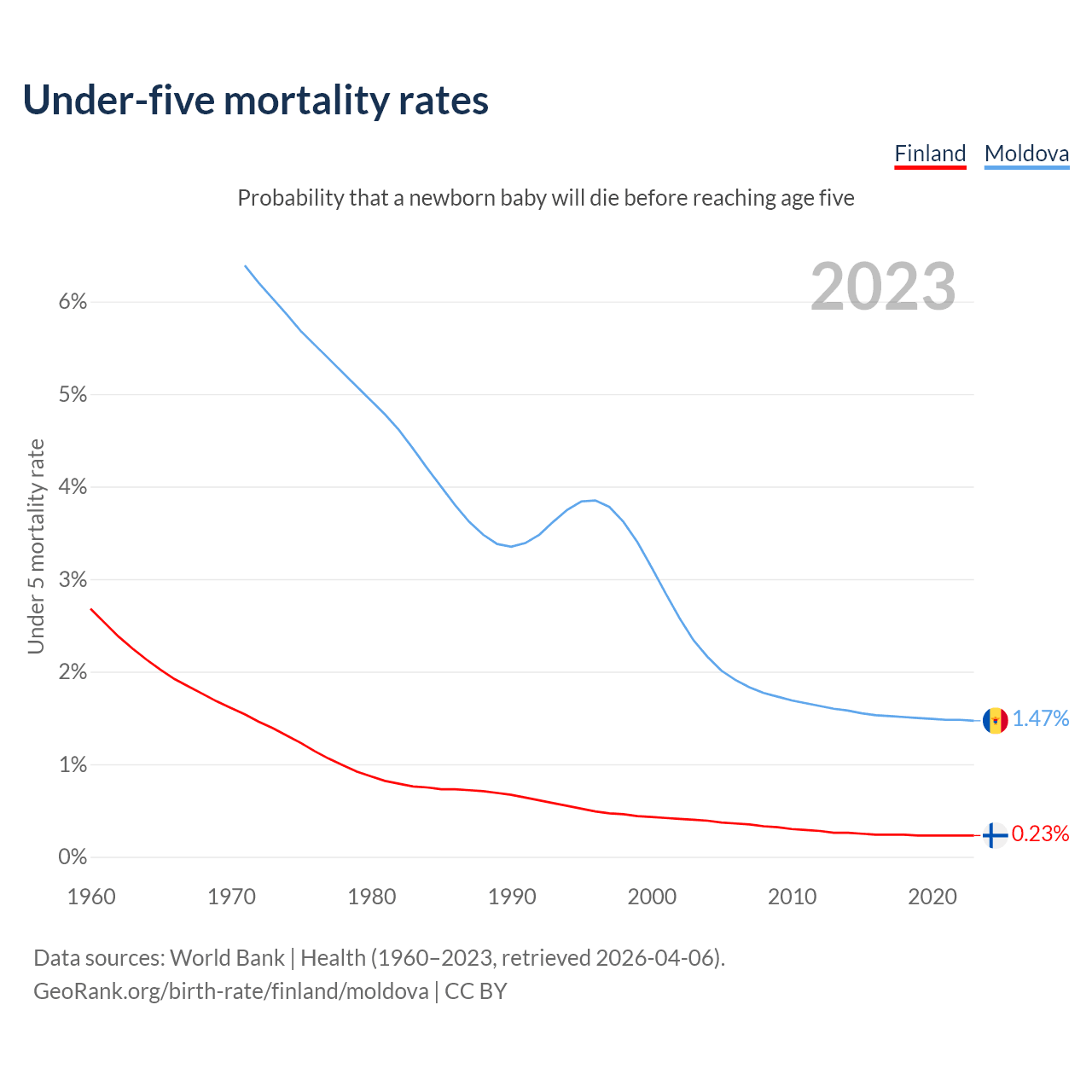 The chance that a newborn baby will die before reaching age five is 0.23% in Finland and 1.47% in Moldova. Above is a chart with historical data on under-five mortality rates.