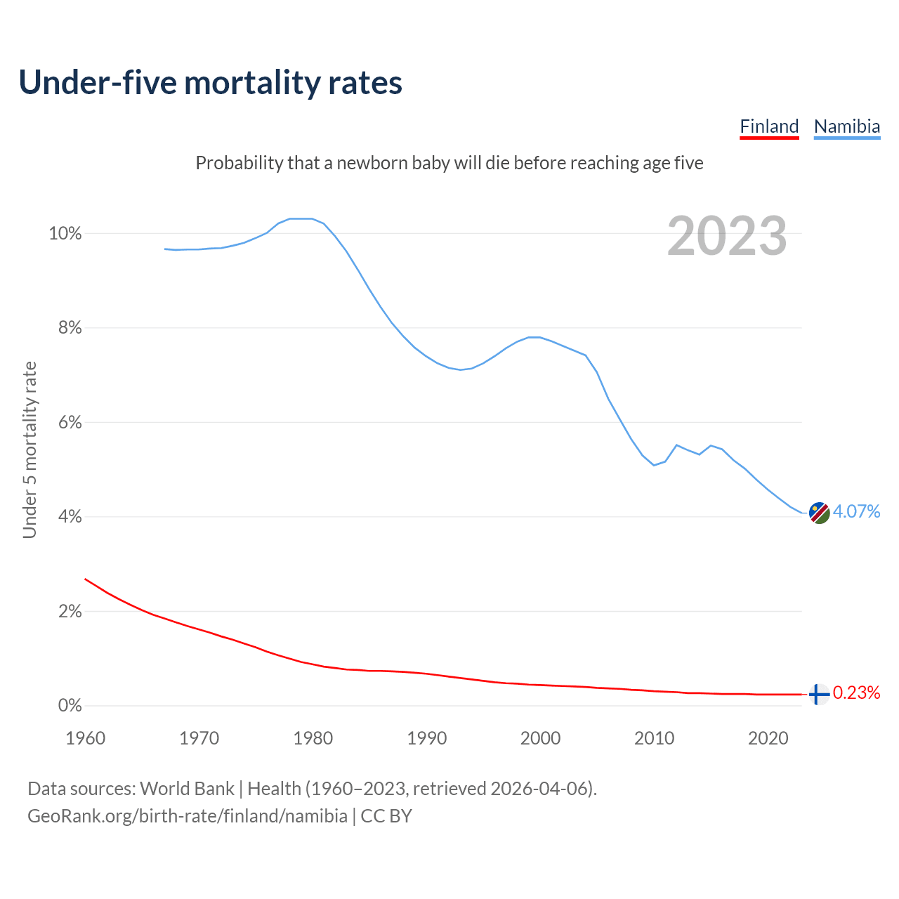 The chance that a newborn baby will die before reaching age five is 0.23% in Finland and 4.07% in Namibia. Above is a chart with historical data on under-five mortality rates.