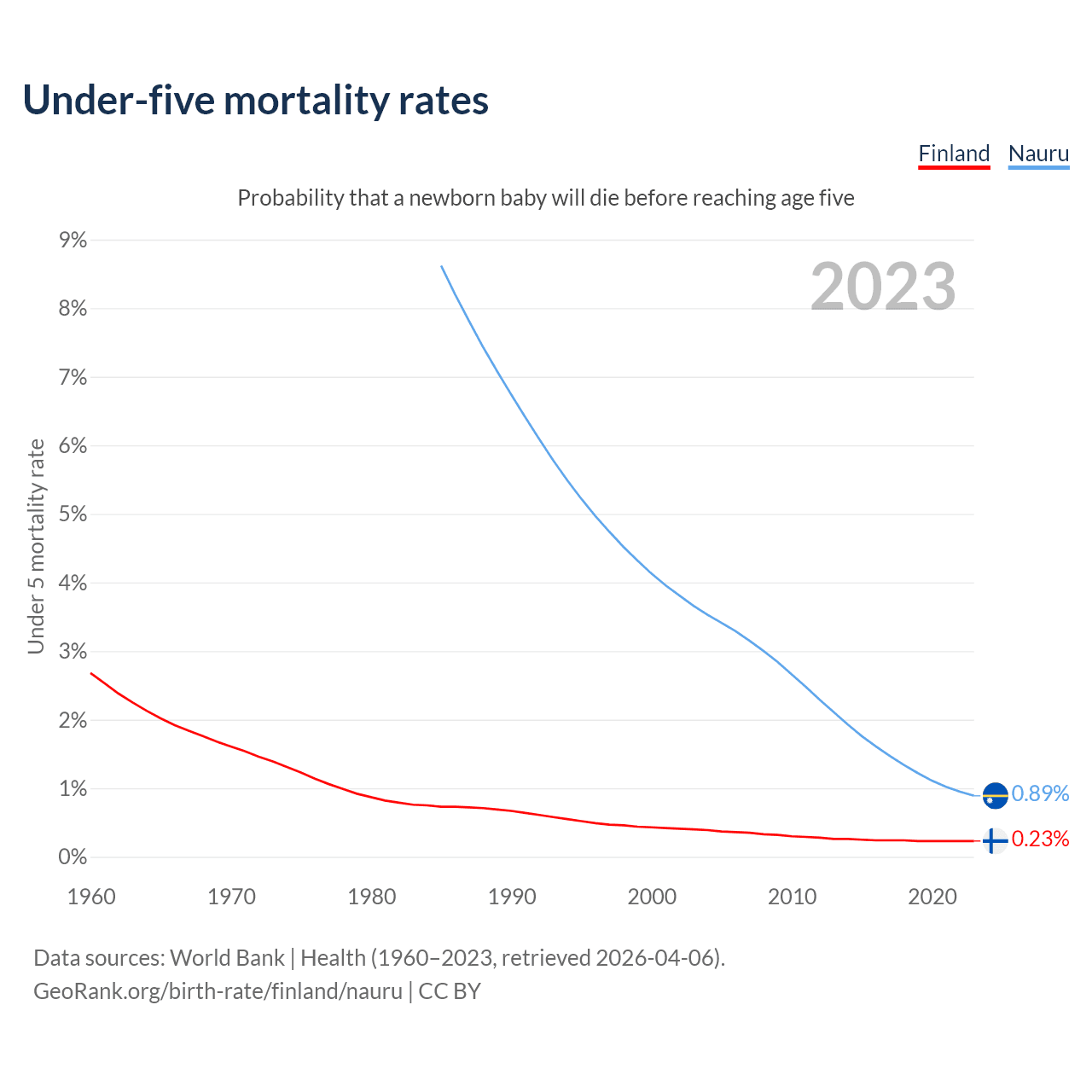 The chance that a newborn baby will die before reaching age five is 0.23% in Finland and 0.89% in Nauru. Above is a chart with historical data on under-five mortality rates.