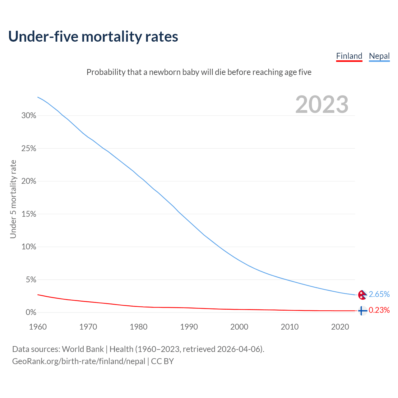 The chance that a newborn baby will die before reaching age five is 0.23% in Finland and 2.65% in Nepal. Above is a chart with historical data on under-five mortality rates.