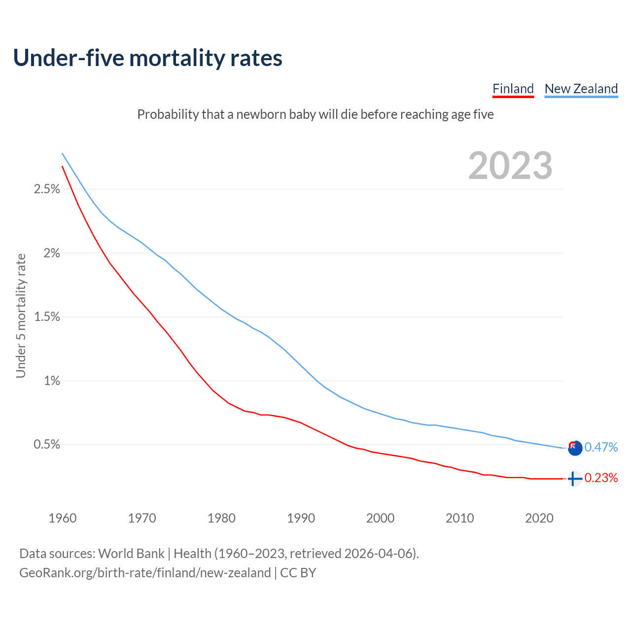 The chance that a newborn baby will die before reaching age five is 0.23% in Finland and 0.47% in New Zealand. Above is a chart with historical data on under-five mortality rates.