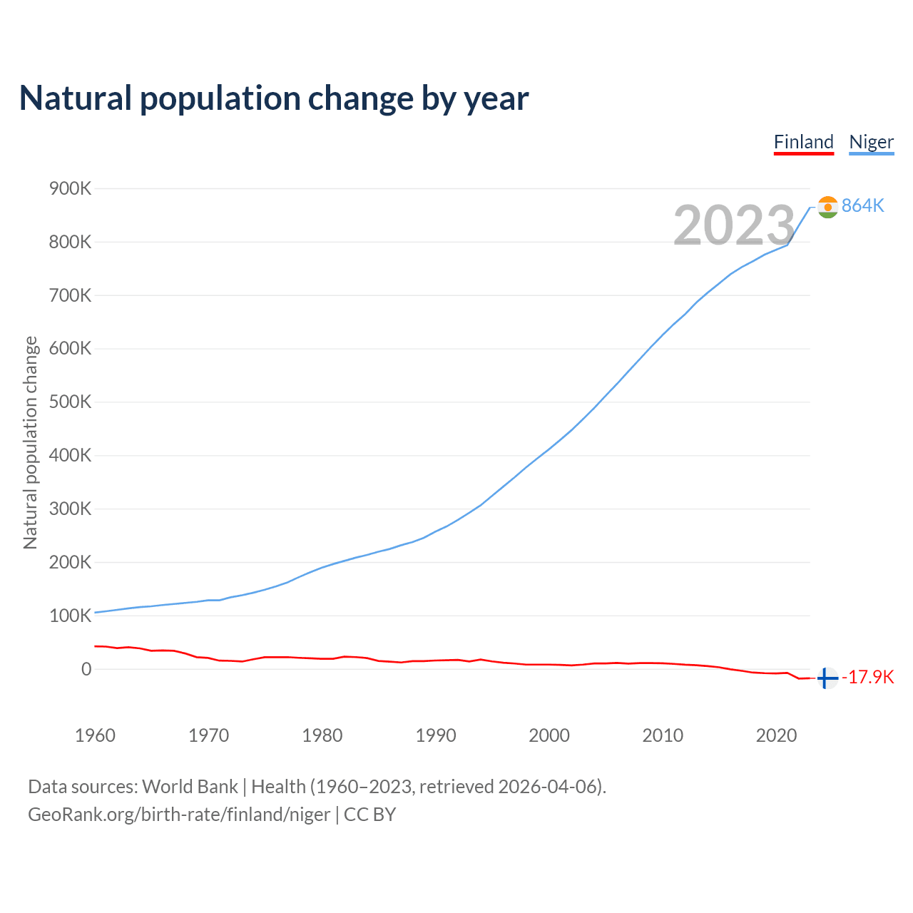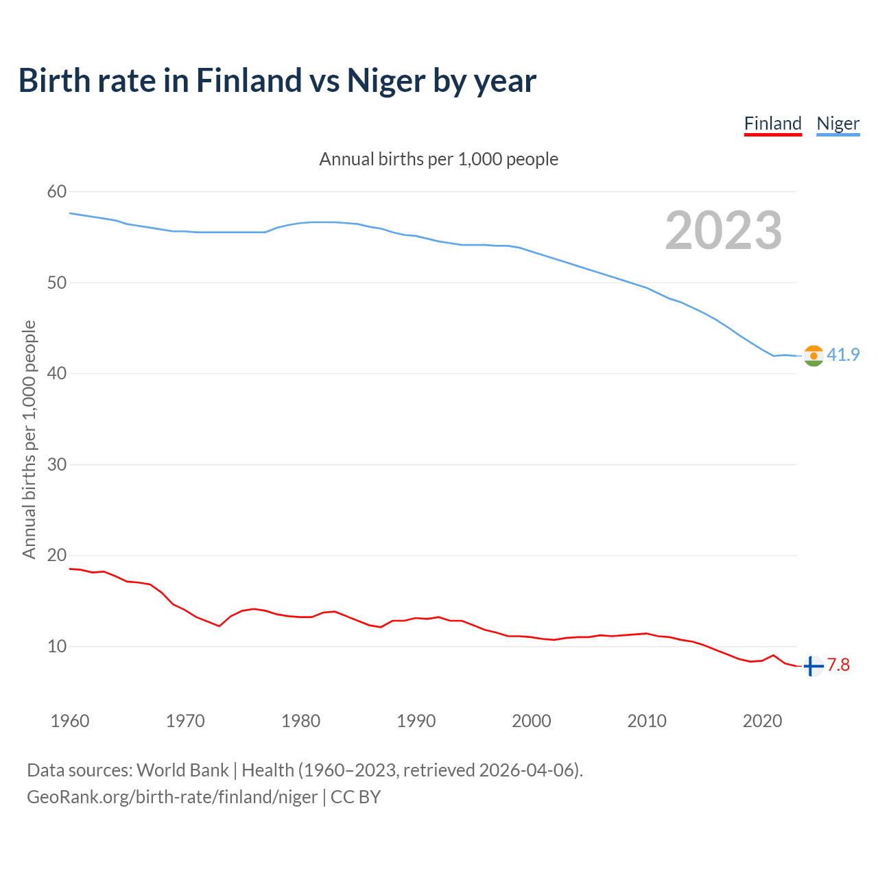 Finland has an annual birth rate of 7.8 births per 1,000 people, compared to 41.9 for Niger. The average number of children a woman is expected to have during her lifetime — the fertility rate, is 1.26 in Finland and 6.06 in Niger — 381% difference.