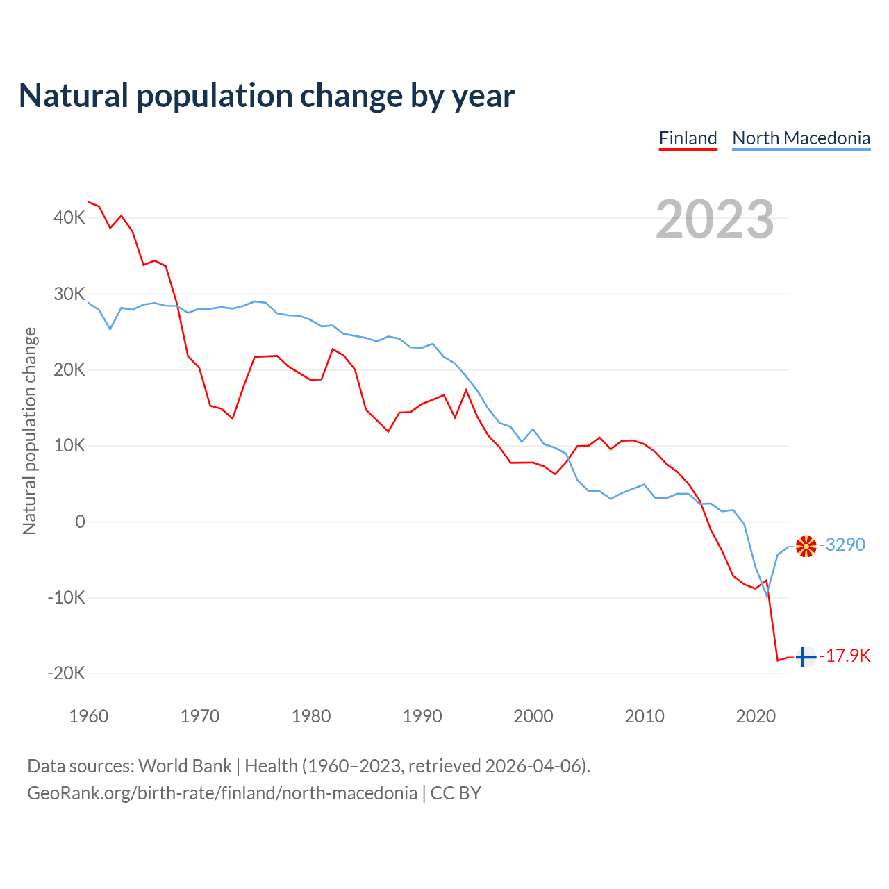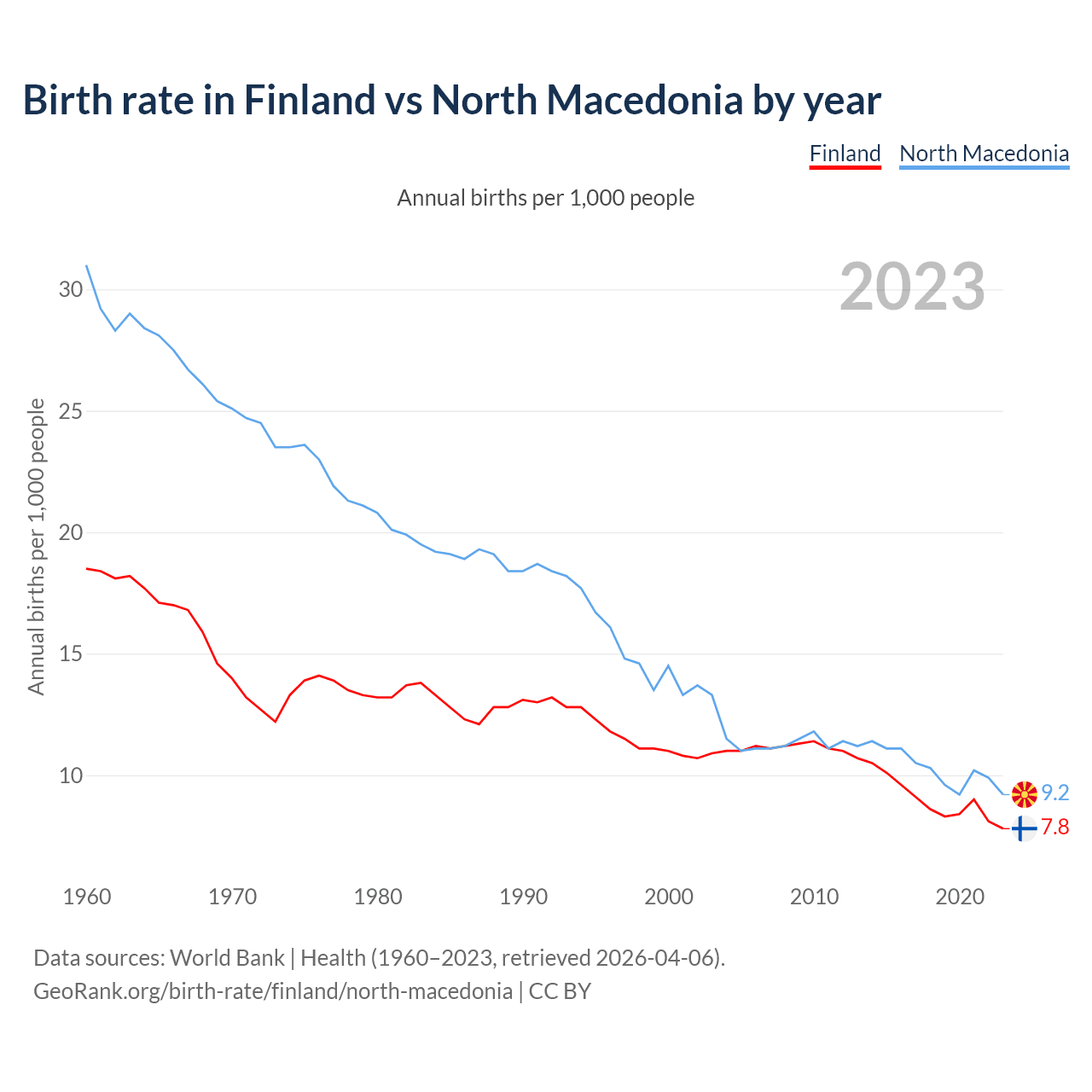 Finland has an annual birth rate of 7.8 births per 1,000 people, compared to 9.2 for North Macedonia. The average number of children a woman is expected to have during her lifetime — the fertility rate, is 1.26 in Finland and 1.5 in North Macedonia — 19% difference.