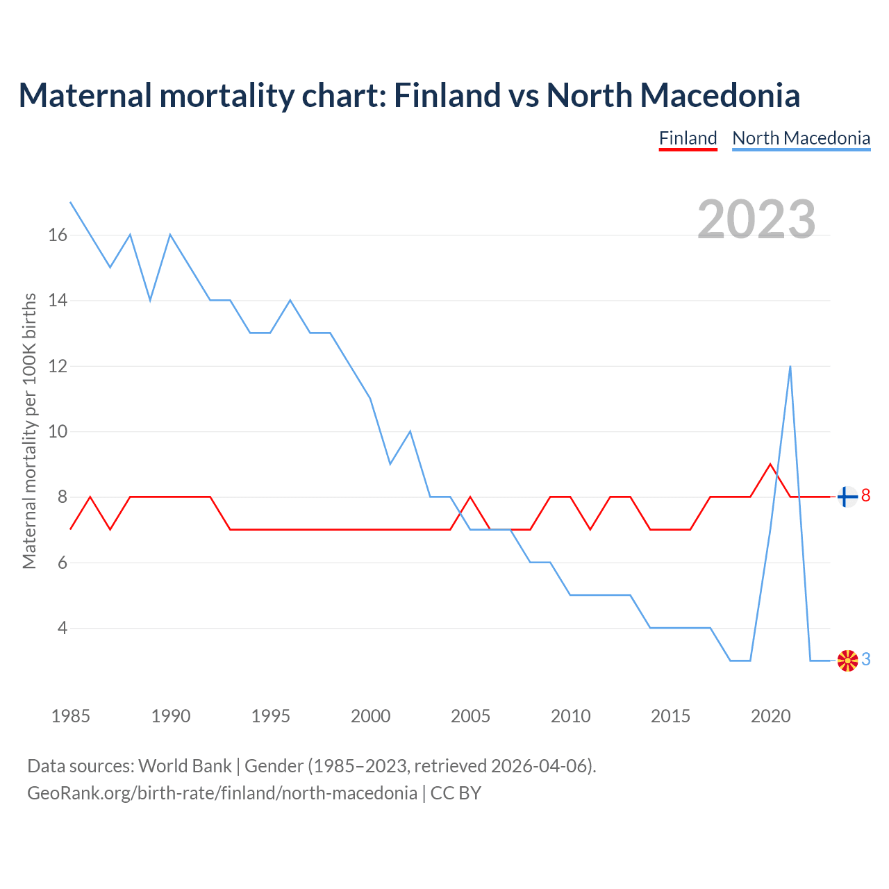 The maternal mortality rate, which is the probability of dying during childbirth or within 42 days of pregnancy termination, is 8 deaths per 100,000 live births in Finland, compared to 3 deaths in North Macedonia.