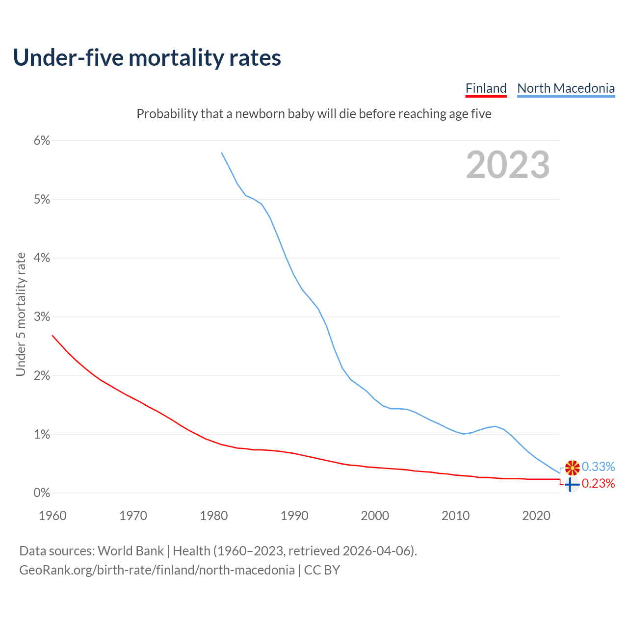 The chance that a newborn baby will die before reaching age five is 0.23% in Finland and 0.33% in North Macedonia. Above is a chart with historical data on under-five mortality rates.