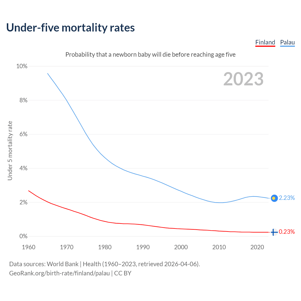 The chance that a newborn baby will die before reaching age five is 0.23% in Finland and 2.23% in Palau. Above is a chart with historical data on under-five mortality rates.