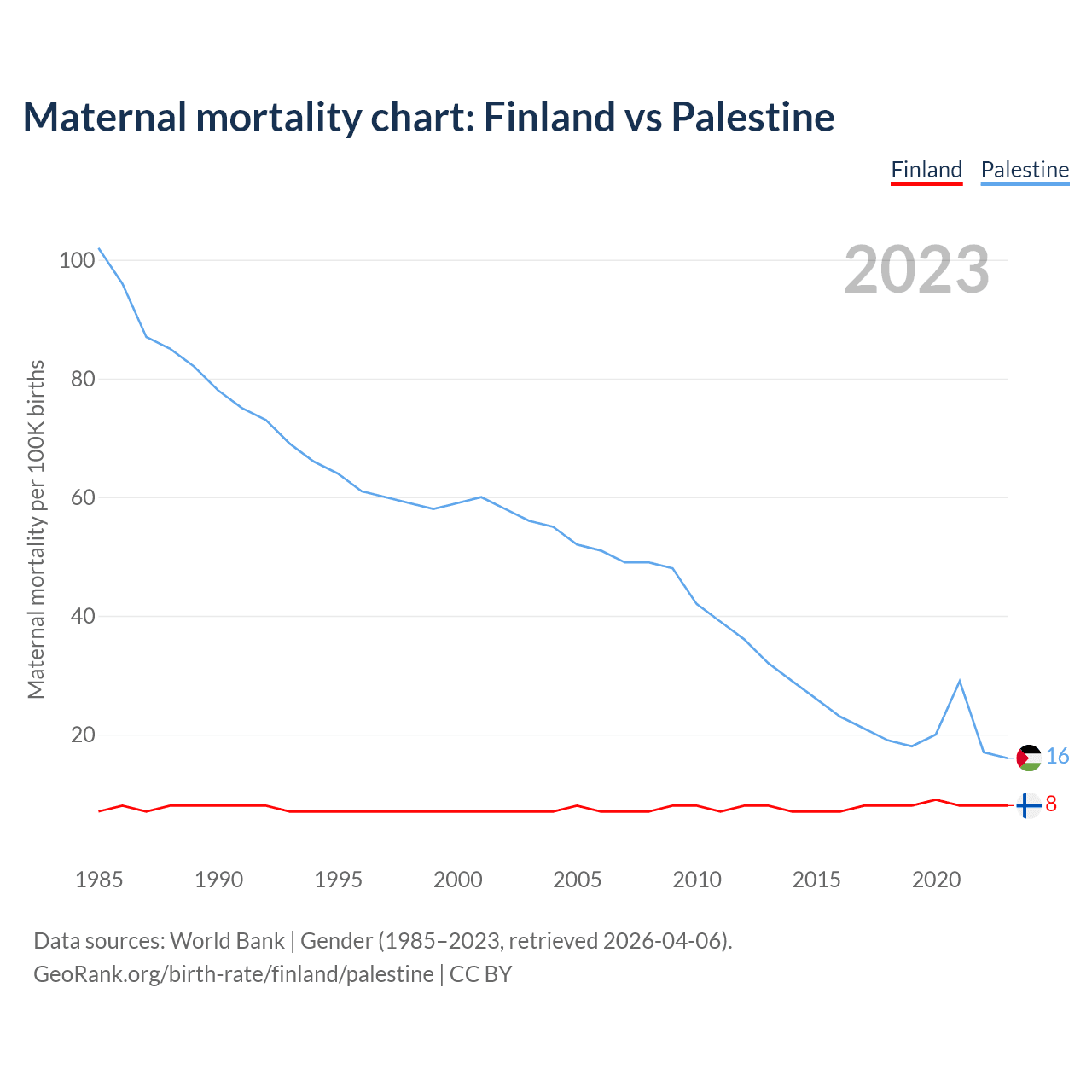 The maternal mortality rate, which is the probability of dying during childbirth or within 42 days of pregnancy termination, is 8 deaths per 100,000 live births in Finland, compared to 16 deaths in Palestine.