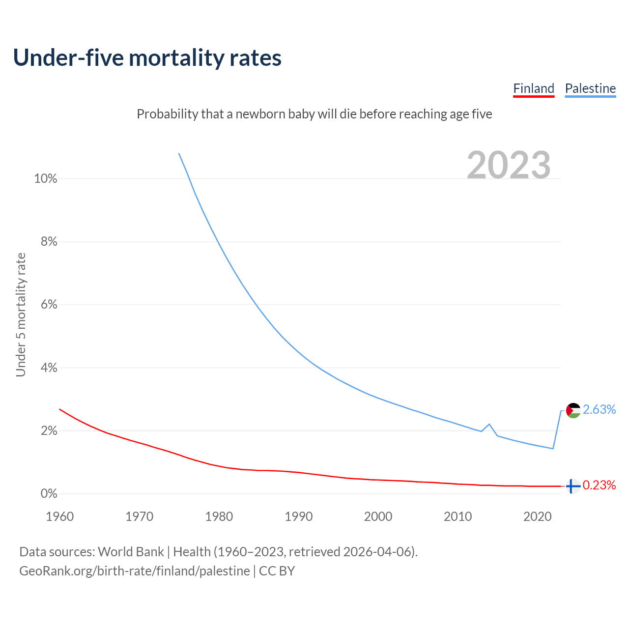 The chance that a newborn baby will die before reaching age five is 0.23% in Finland and 2.63% in Palestine. Above is a chart with historical data on under-five mortality rates.