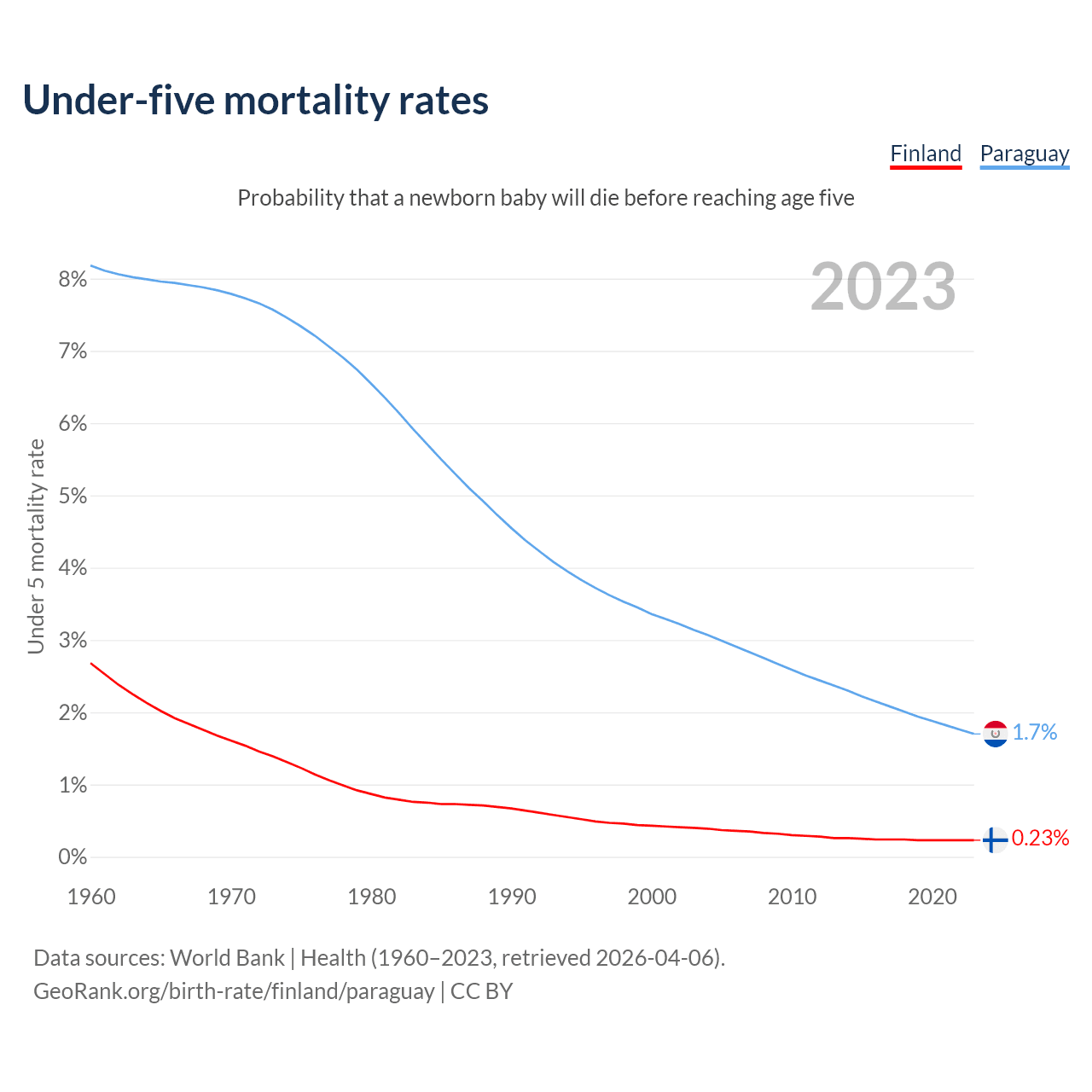 The chance that a newborn baby will die before reaching age five is 0.23% in Finland and 1.7% in Paraguay. Above is a chart with historical data on under-five mortality rates.