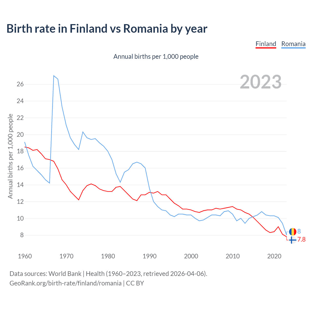Finland has an annual birth rate of 7.8 births per 1,000 people, compared to 8 for Romania. The average number of children a woman is expected to have during her lifetime — the fertility rate, is 1.26 in Finland and 1.71 in Romania — 35.7% difference.