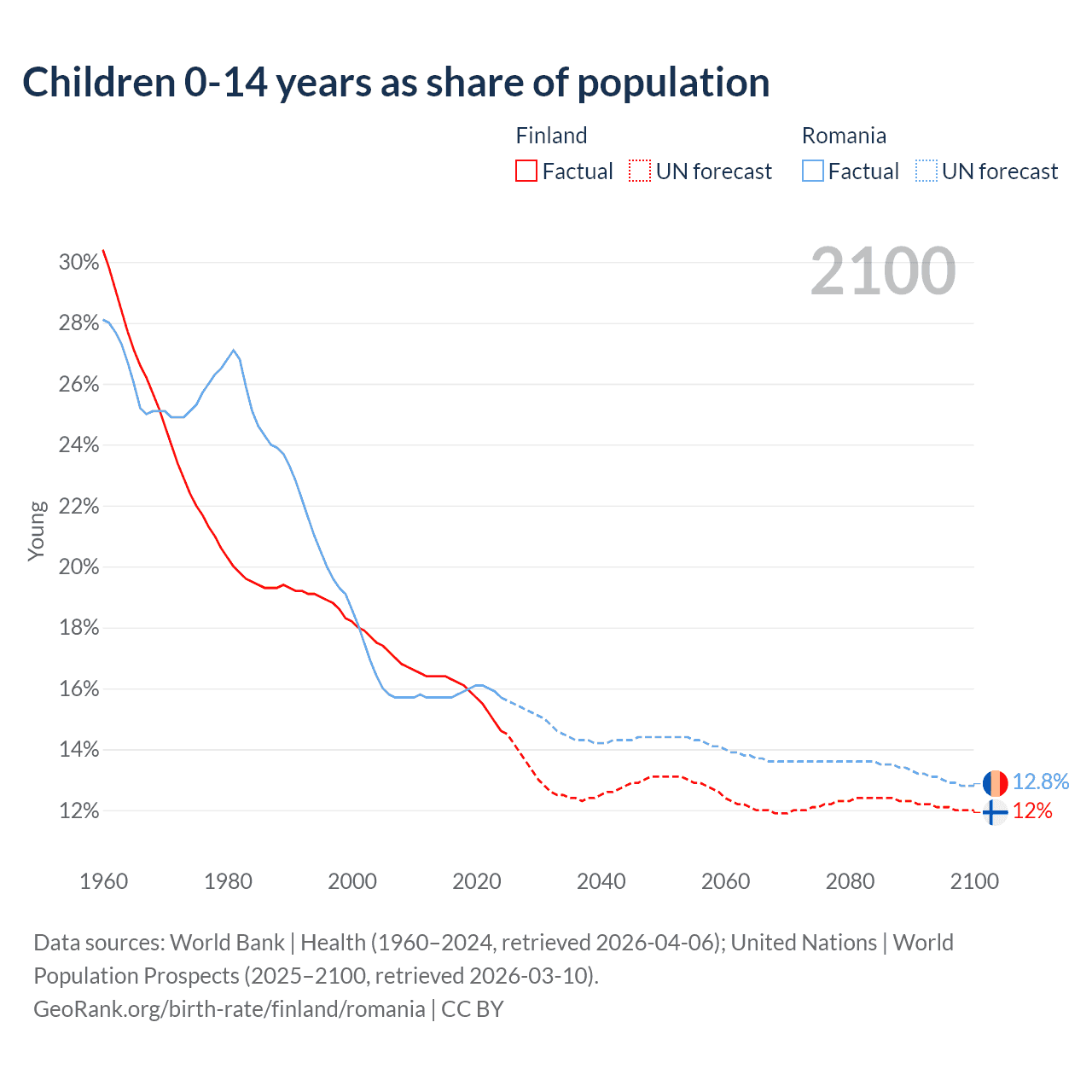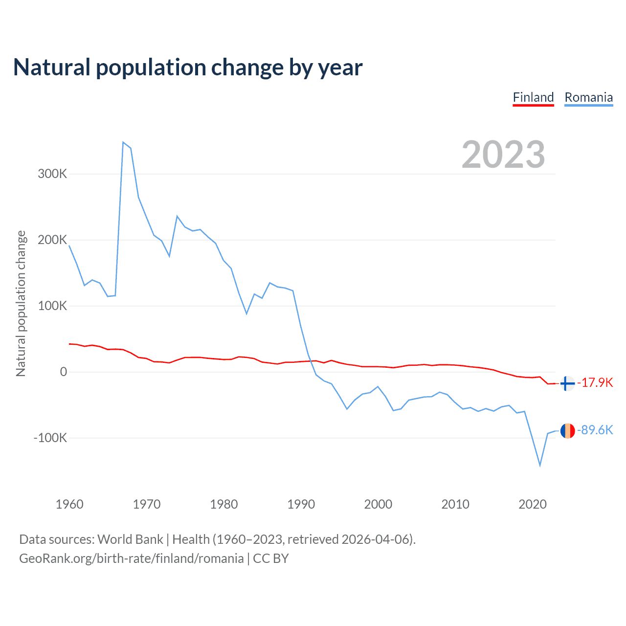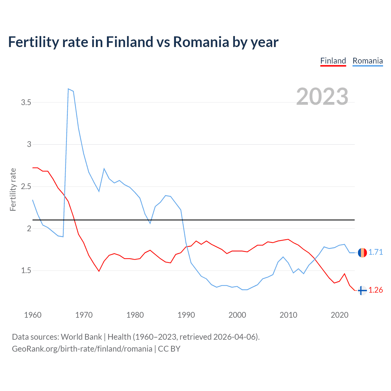 According to the latest available data on birth rates, the fertility rate in Finland was 1.26 children per woman in 2023, compared to 1.71 in Romania in 2023. The replacement level is considered to be 2.1 children per woman.