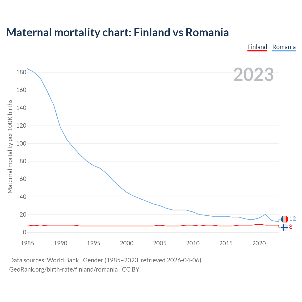 The maternal mortality rate, which is the probability of dying during childbirth or within 42 days of pregnancy termination, is 8 deaths per 100,000 live births in Finland, compared to 12 deaths in Romania.