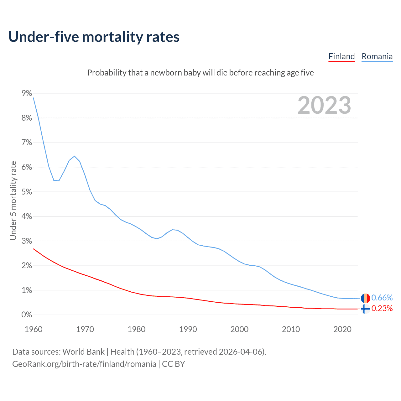 The chance that a newborn baby will die before reaching age five is 0.23% in Finland and 0.66% in Romania. Above is a chart with historical data on under-five mortality rates.