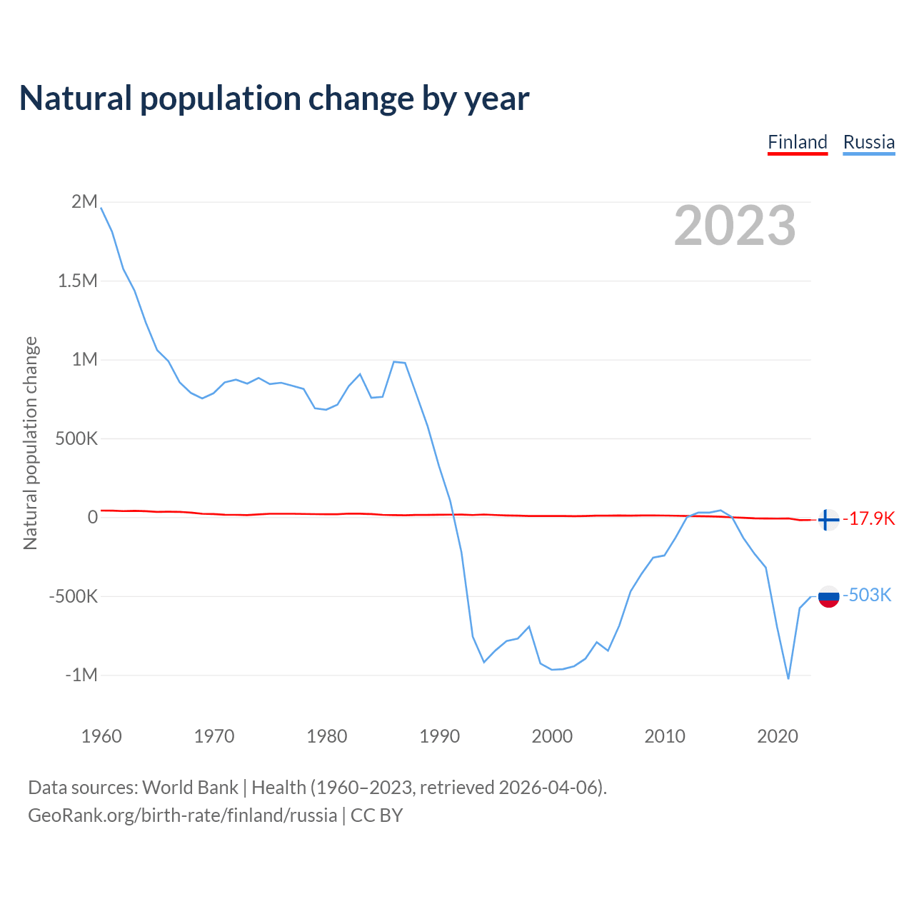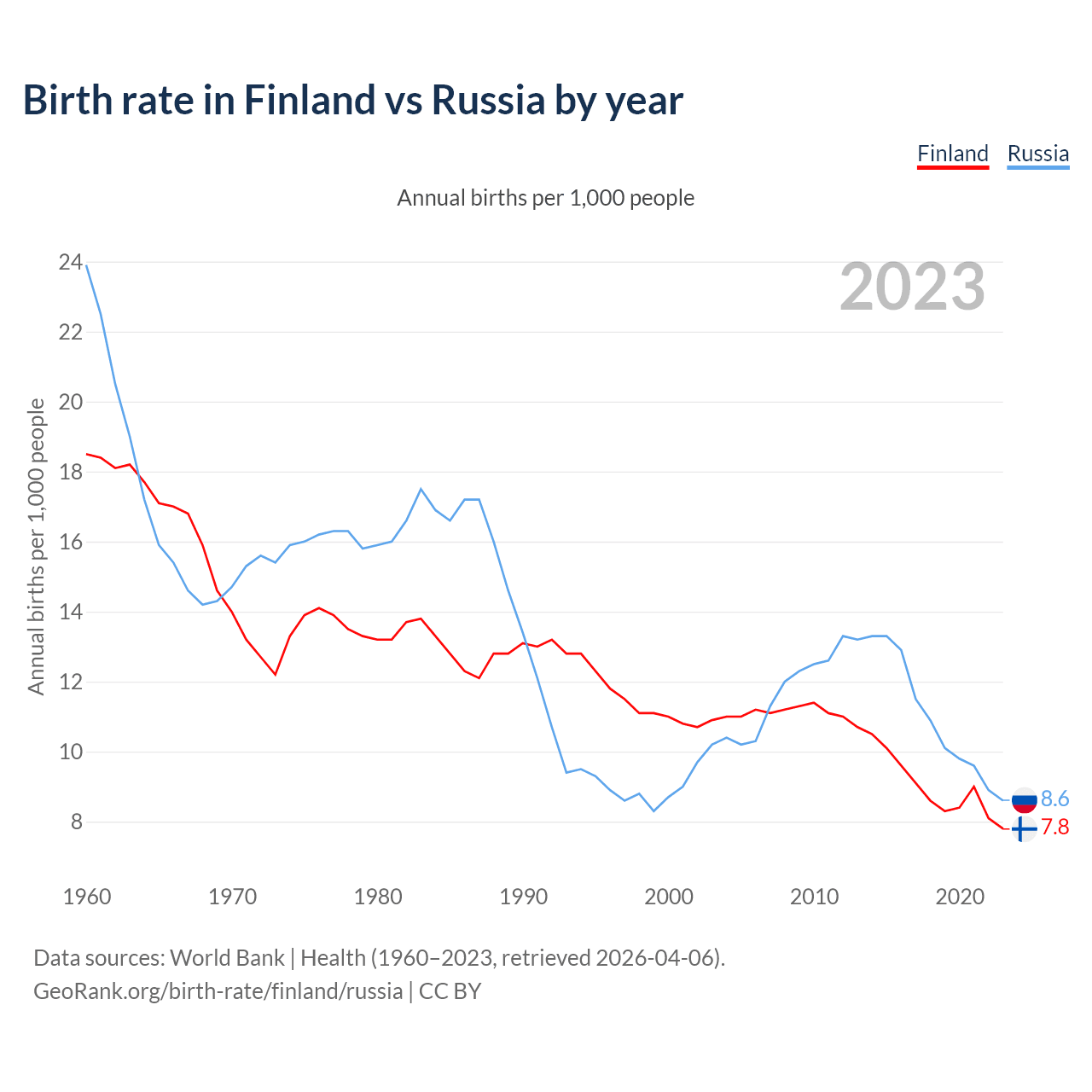 Finland has an annual birth rate of 7.8 births per 1,000 people, compared to 8.6 for Russia. The average number of children a woman is expected to have during her lifetime — the fertility rate, is 1.26 in Finland and 1.41 in Russia — 11.9% difference.