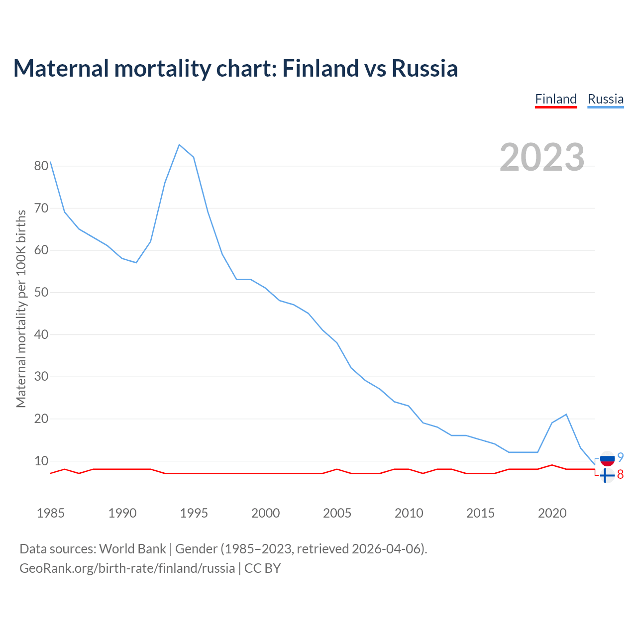 The maternal mortality rate, which is the probability of dying during childbirth or within 42 days of pregnancy termination, is 8 deaths per 100,000 live births in Finland, compared to 9 deaths in Russia.