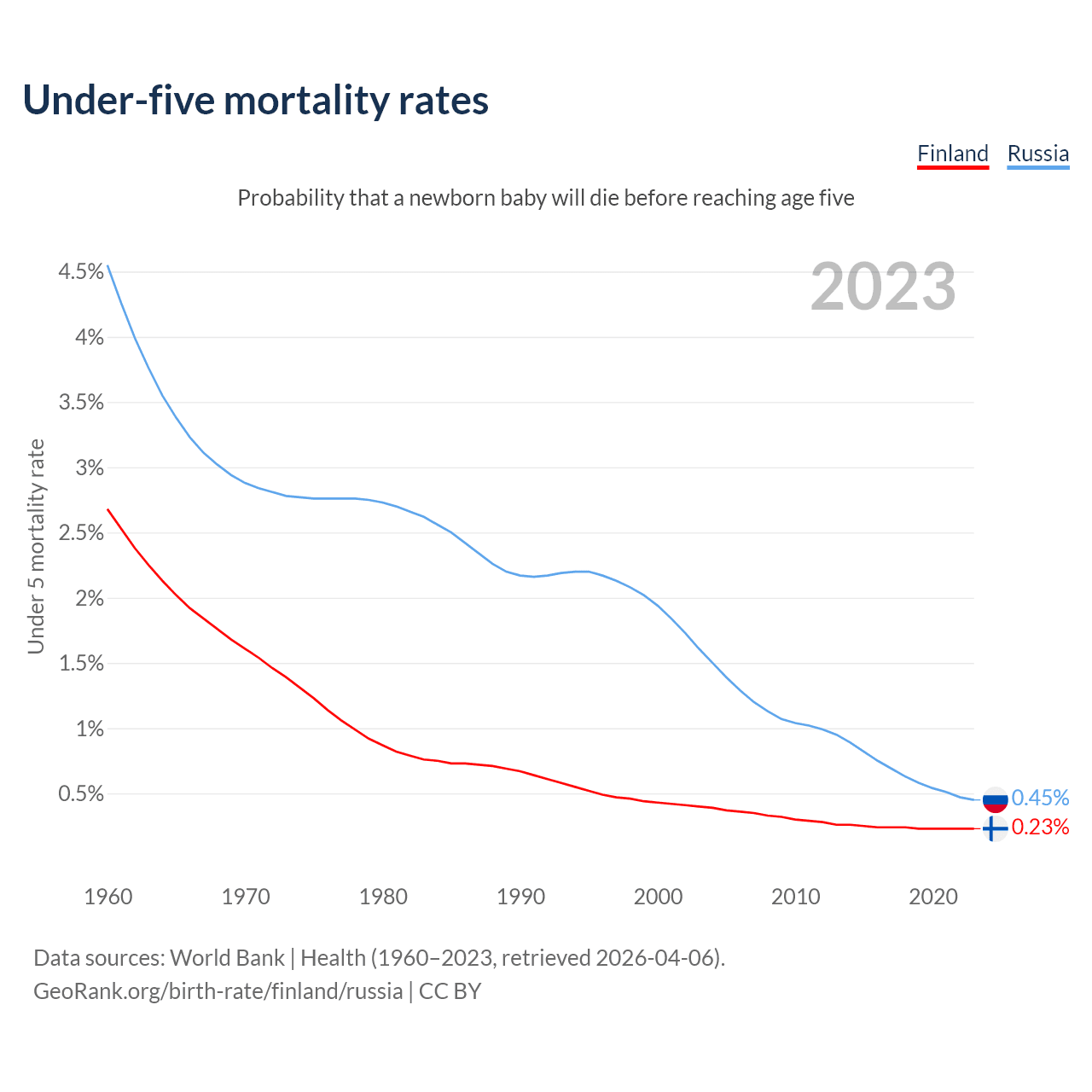 The chance that a newborn baby will die before reaching age five is 0.23% in Finland and 0.45% in Russia. Above is a chart with historical data on under-five mortality rates.