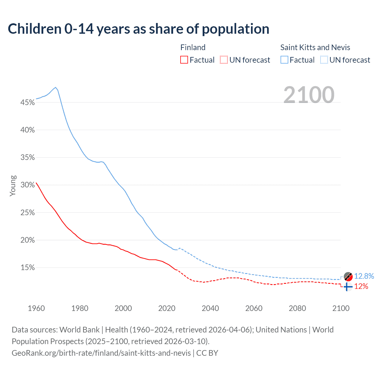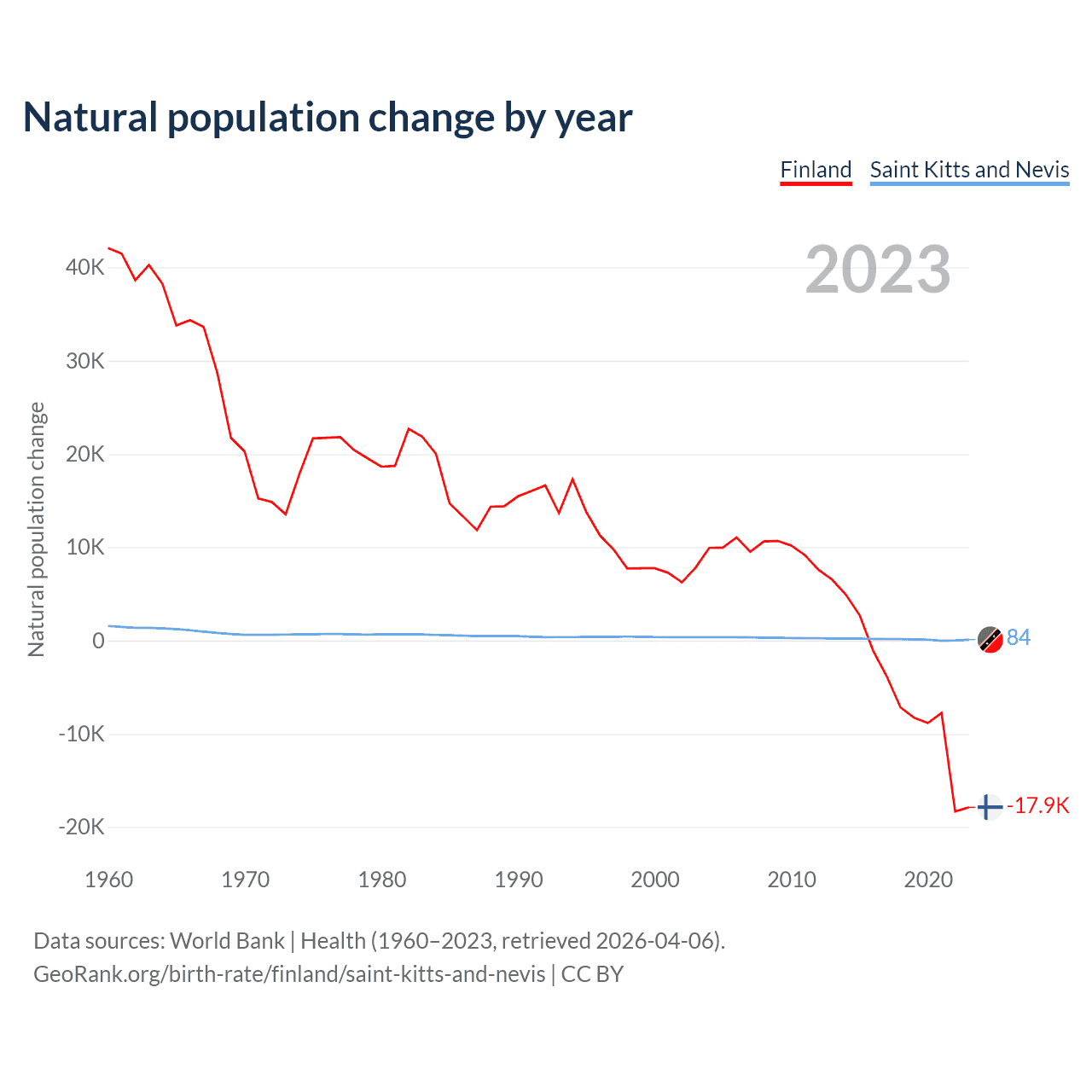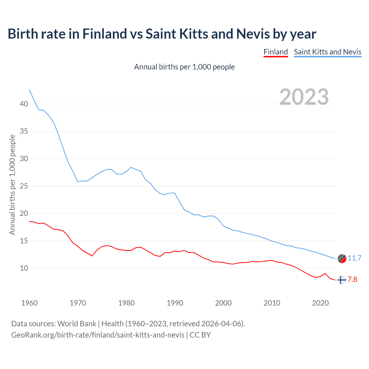 Finland has an annual birth rate of 7.8 births per 1,000 people, compared to 11.7 for Saint Kitts and Nevis. The average number of children a woman is expected to have during her lifetime — the fertility rate, is 1.26 in Finland and 1.51 in Saint Kitts and Nevis — 19.4% difference.