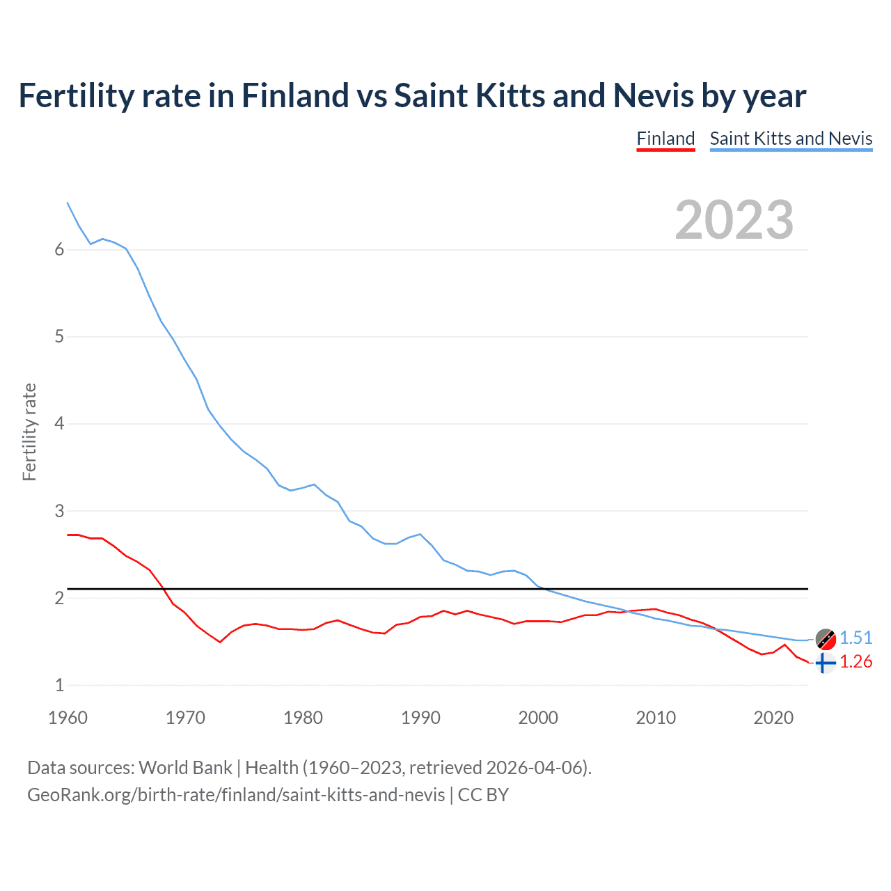 According to the latest available data on birth rates, the fertility rate in Finland was 1.26 children per woman in 2023, compared to 1.51 in Saint Kitts and Nevis in 2023. The replacement level is considered to be 2.1 children per woman.