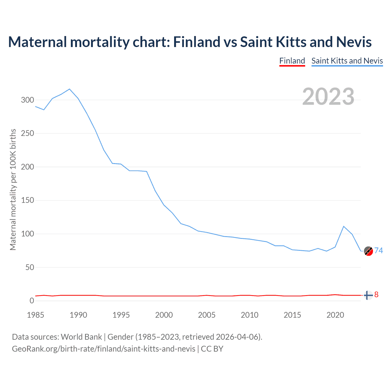 The maternal mortality rate, which is the probability of dying during childbirth or within 42 days of pregnancy termination, is 8 deaths per 100,000 live births in Finland, compared to 74 deaths in Saint Kitts and Nevis.