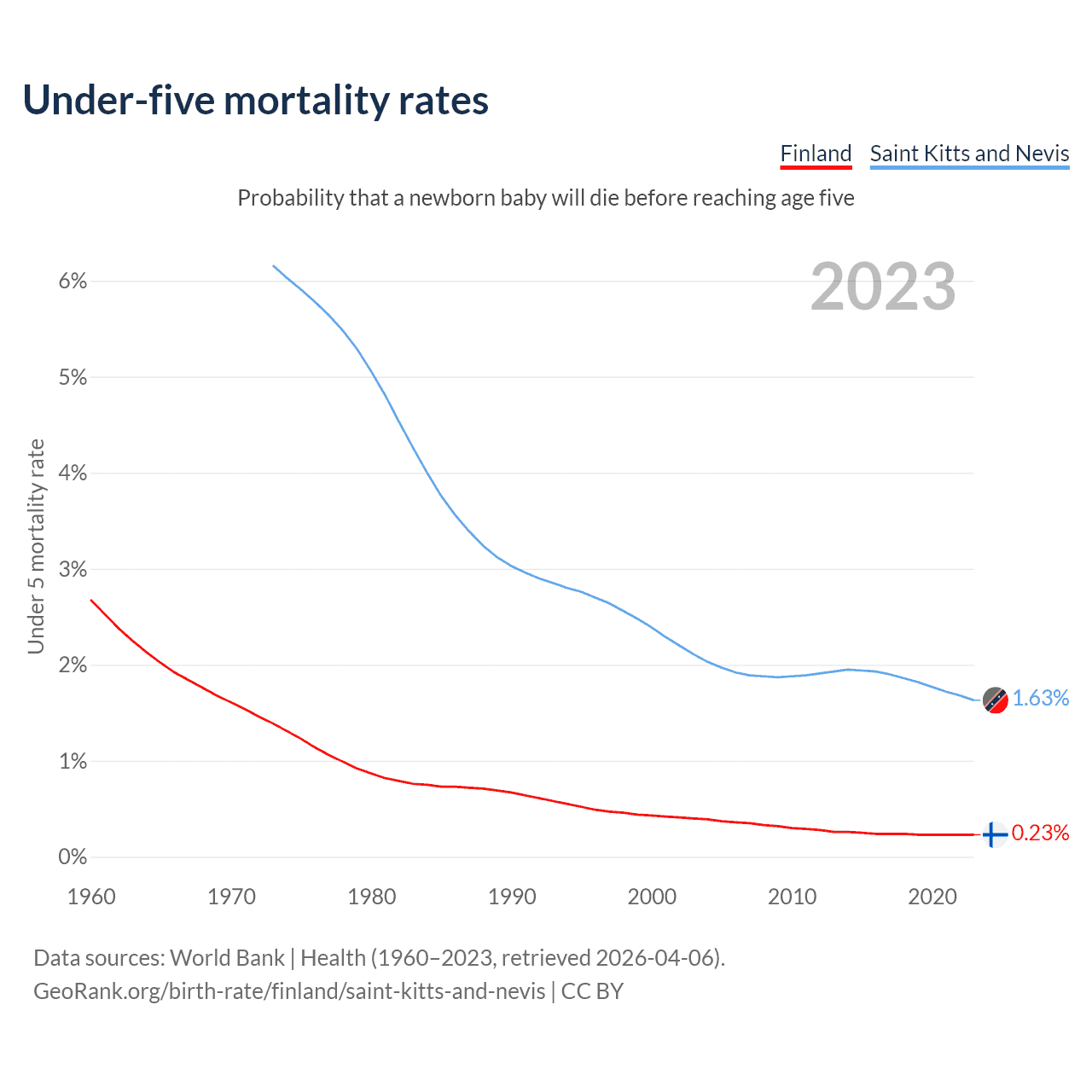 The chance that a newborn baby will die before reaching age five is 0.23% in Finland and 1.63% in Saint Kitts and Nevis. Above is a chart with historical data on under-five mortality rates.