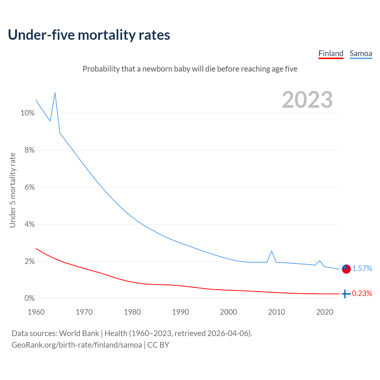 The chance that a newborn baby will die before reaching age five is 0.23% in Finland and 1.57% in Samoa. Above is a chart with historical data on under-five mortality rates.