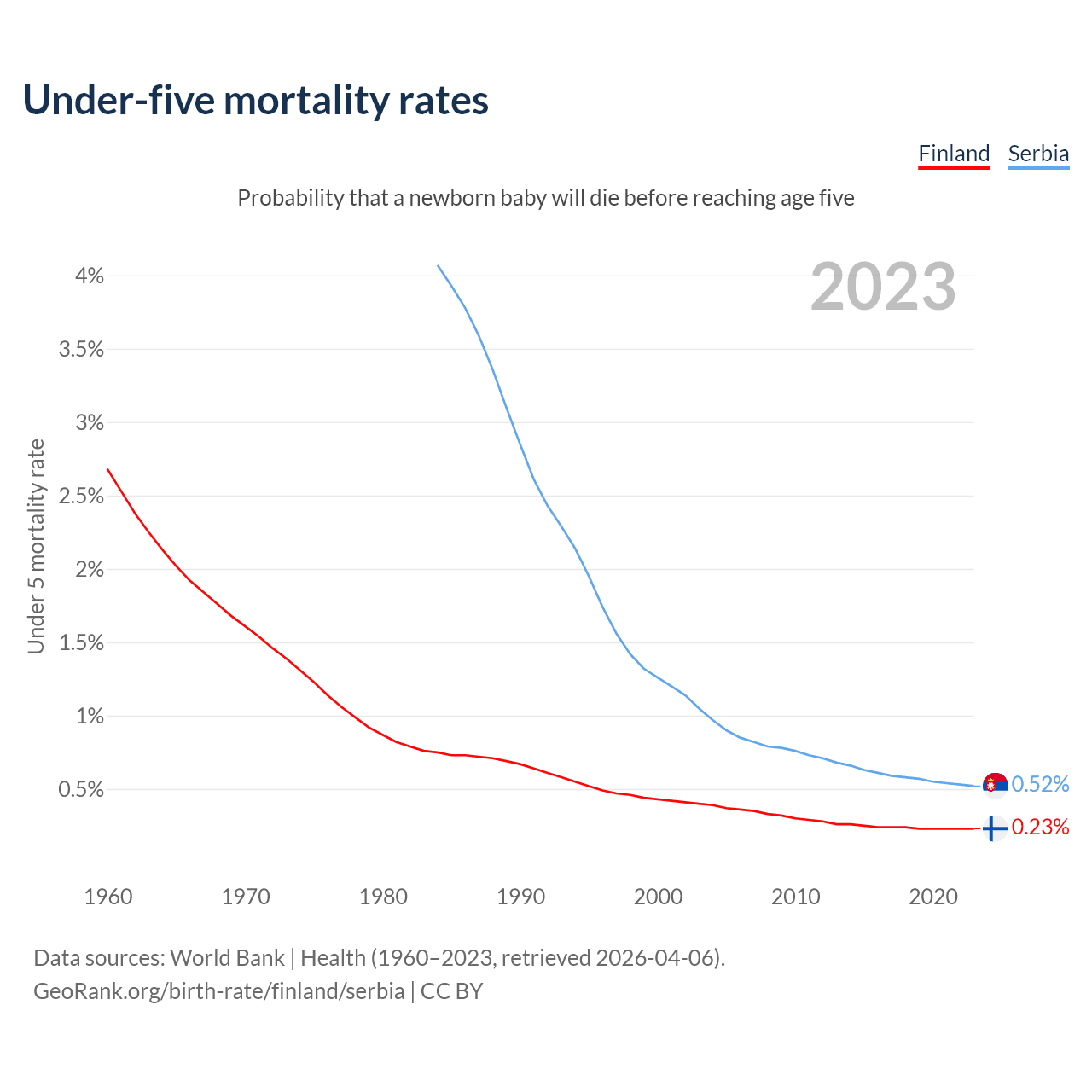 The chance that a newborn baby will die before reaching age five is 0.23% in Finland and 0.52% in Serbia. Above is a chart with historical data on under-five mortality rates.