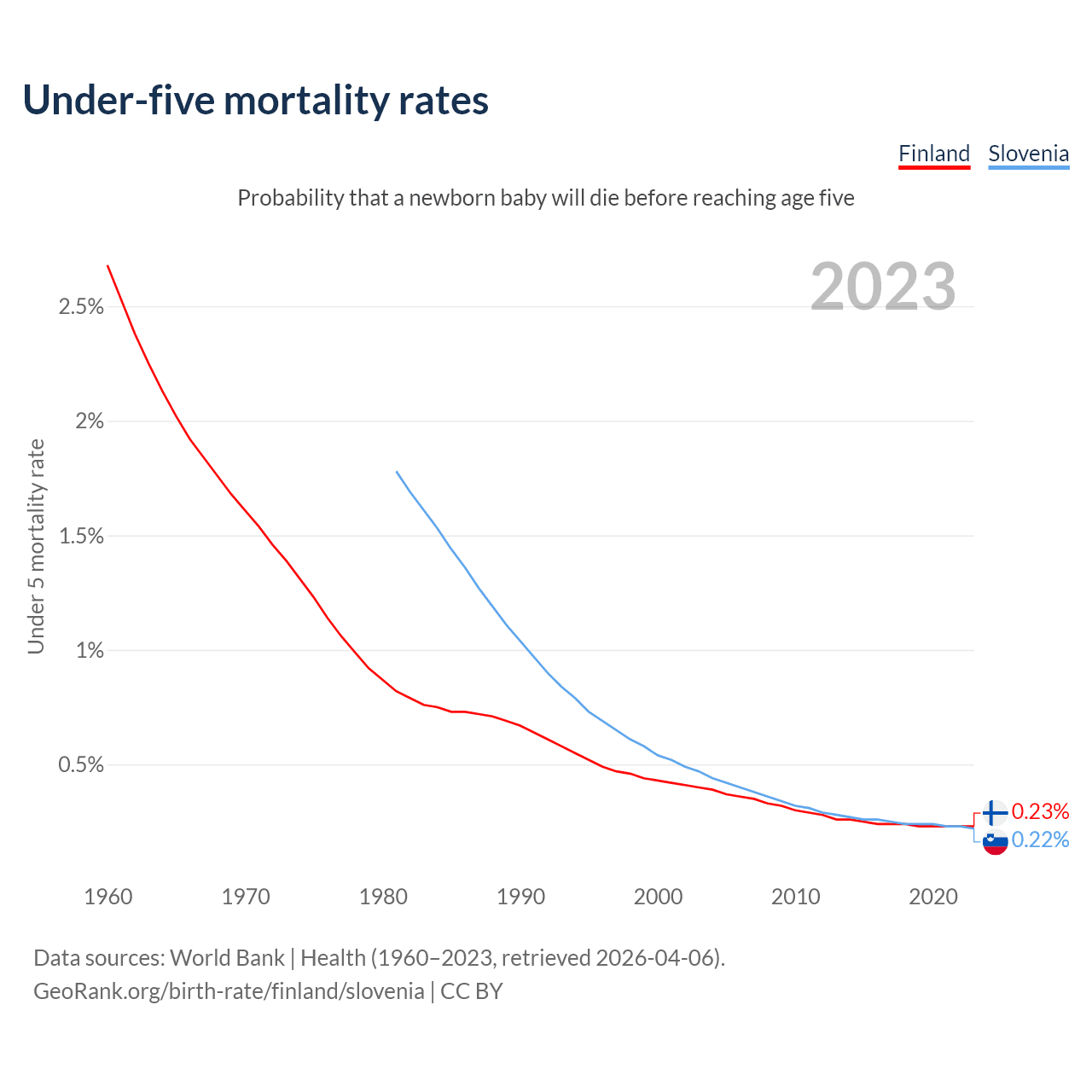 The chance that a newborn baby will die before reaching age five is 0.23% in Finland and 0.22% in Slovenia. Above is a chart with historical data on under-five mortality rates.