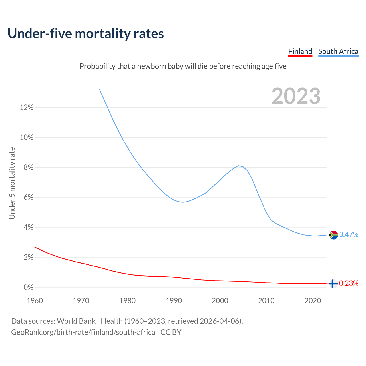 The chance that a newborn baby will die before reaching age five is 0.23% in Finland and 3.47% in South Africa. Above is a chart with historical data on under-five mortality rates.