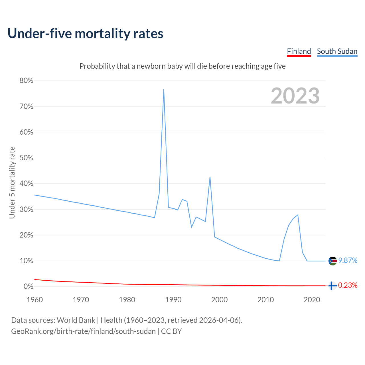 The chance that a newborn baby will die before reaching age five is 0.23% in Finland and 9.87% in South Sudan. Above is a chart with historical data on under-five mortality rates.