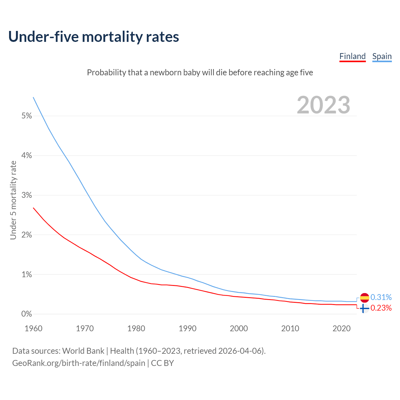 The chance that a newborn baby will die before reaching age five is 0.23% in Finland and 0.31% in Spain. Above is a chart with historical data on under-five mortality rates.