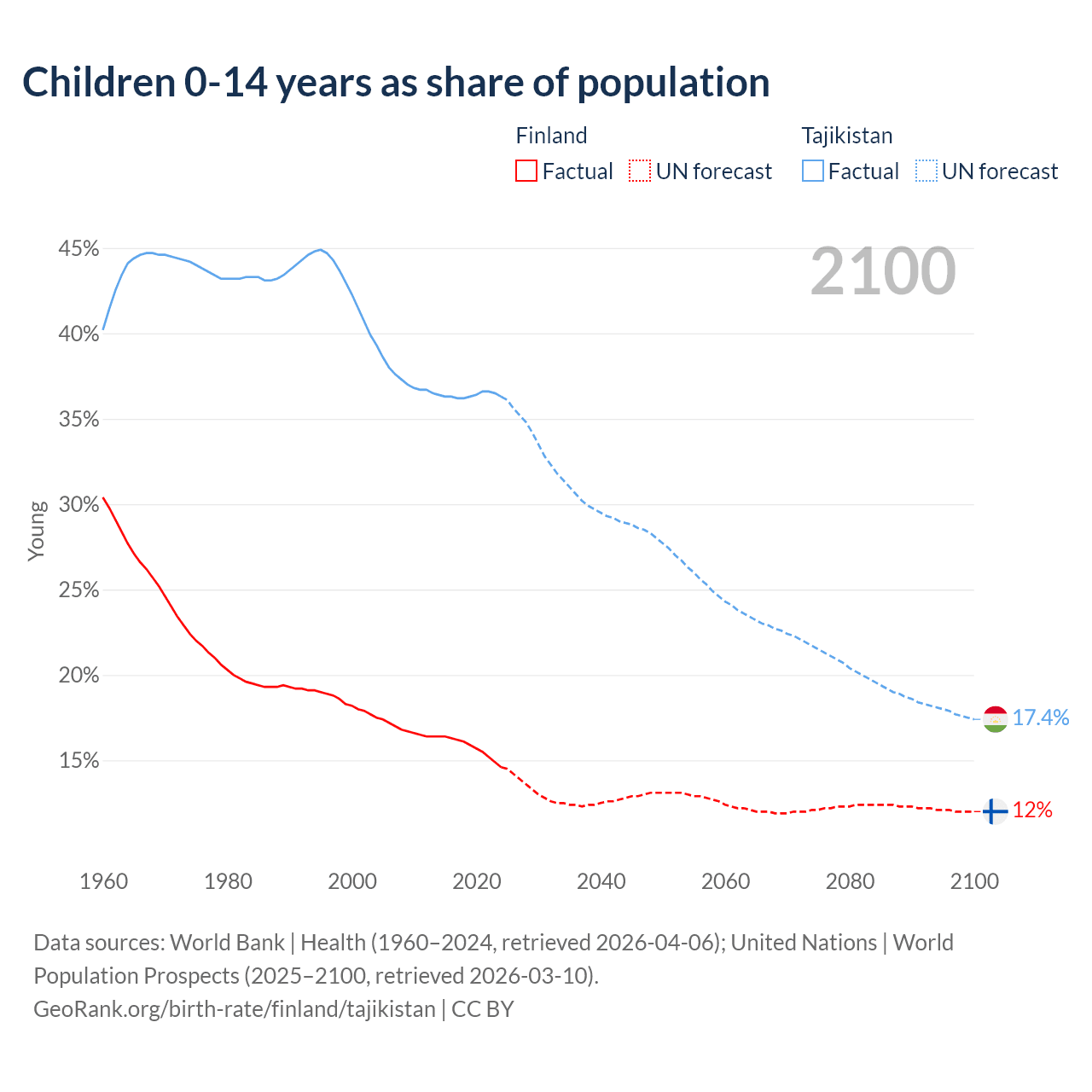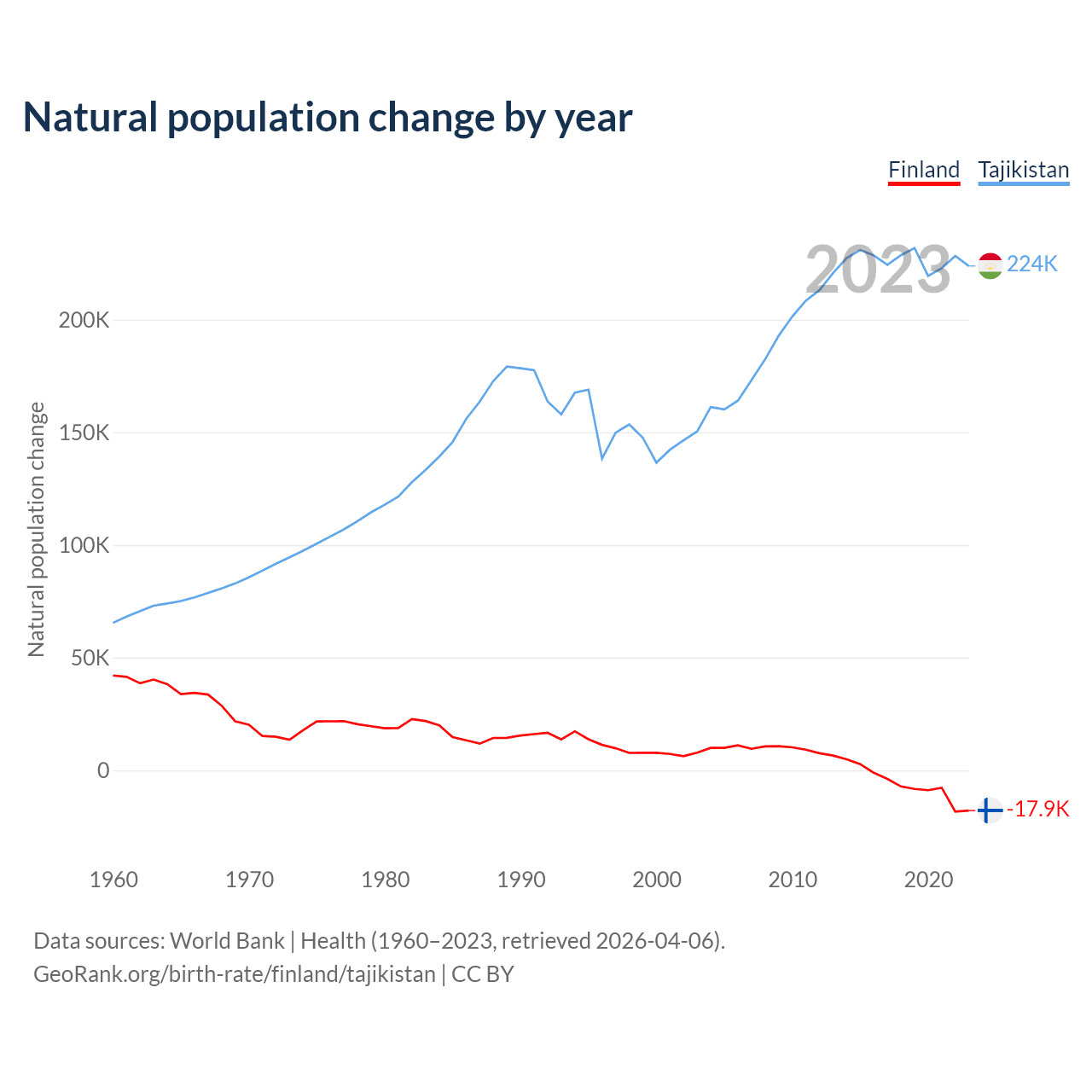 Finland has an annual birth rate of 7.8 births per 1,000 people, compared to 26.1 for Tajikistan. The average number of children a woman is expected to have during her lifetime — the fertility rate, is 1.26 in Finland and 3.07 in Tajikistan — 143.8% difference.