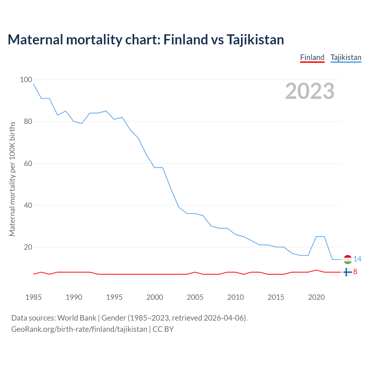 The maternal mortality rate, which is the probability of dying during childbirth or within 42 days of pregnancy termination, is 8 deaths per 100,000 live births in Finland, compared to 14 deaths in Tajikistan.