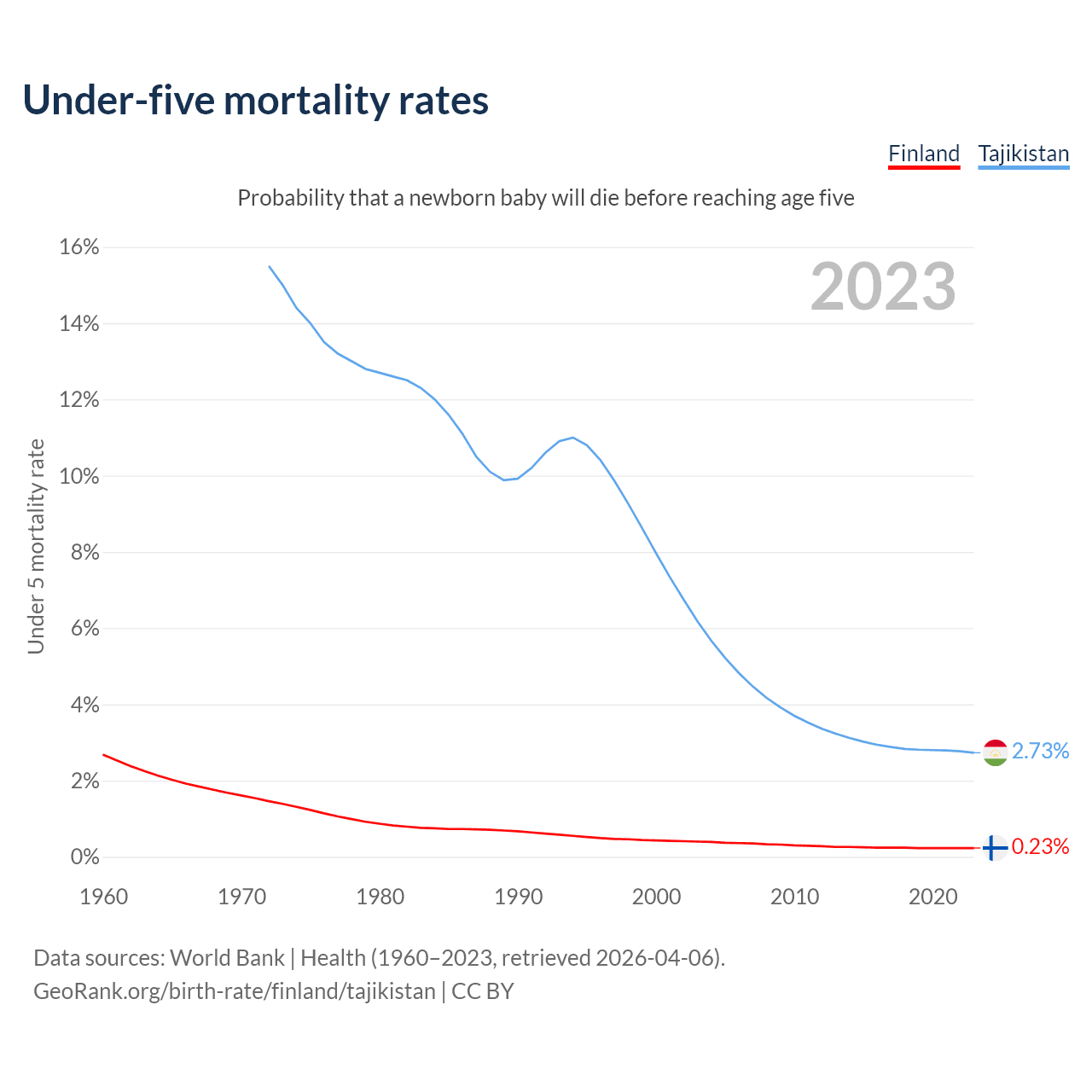 The chance that a newborn baby will die before reaching age five is 0.23% in Finland and 2.73% in Tajikistan. Above is a chart with historical data on under-five mortality rates.