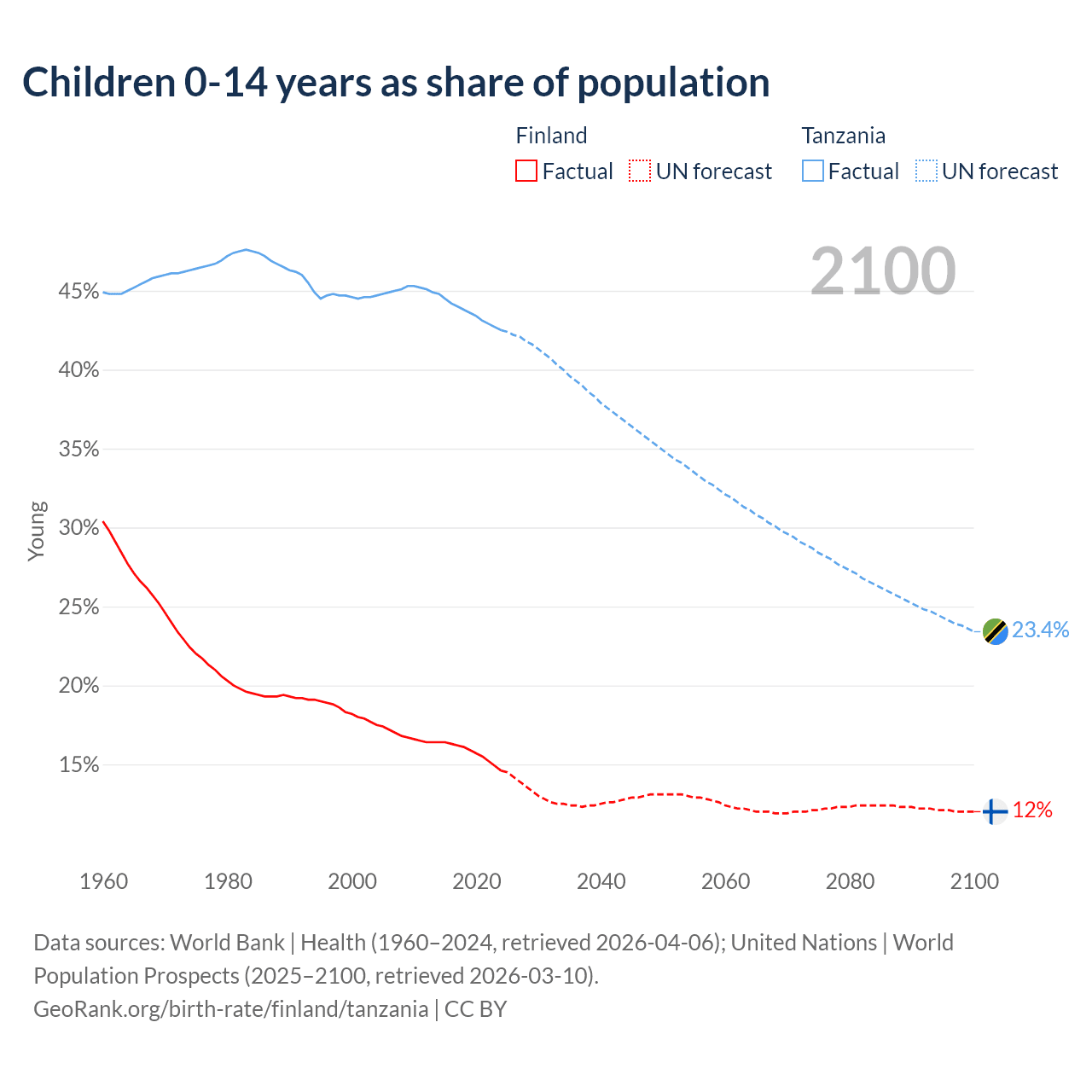 According to the latest available data on birth rates, the fertility rate in Finland was 1.26 children per woman in 2023, compared to 4.61 in Tanzania in 2023. The replacement level is considered to be 2.1 children per woman.