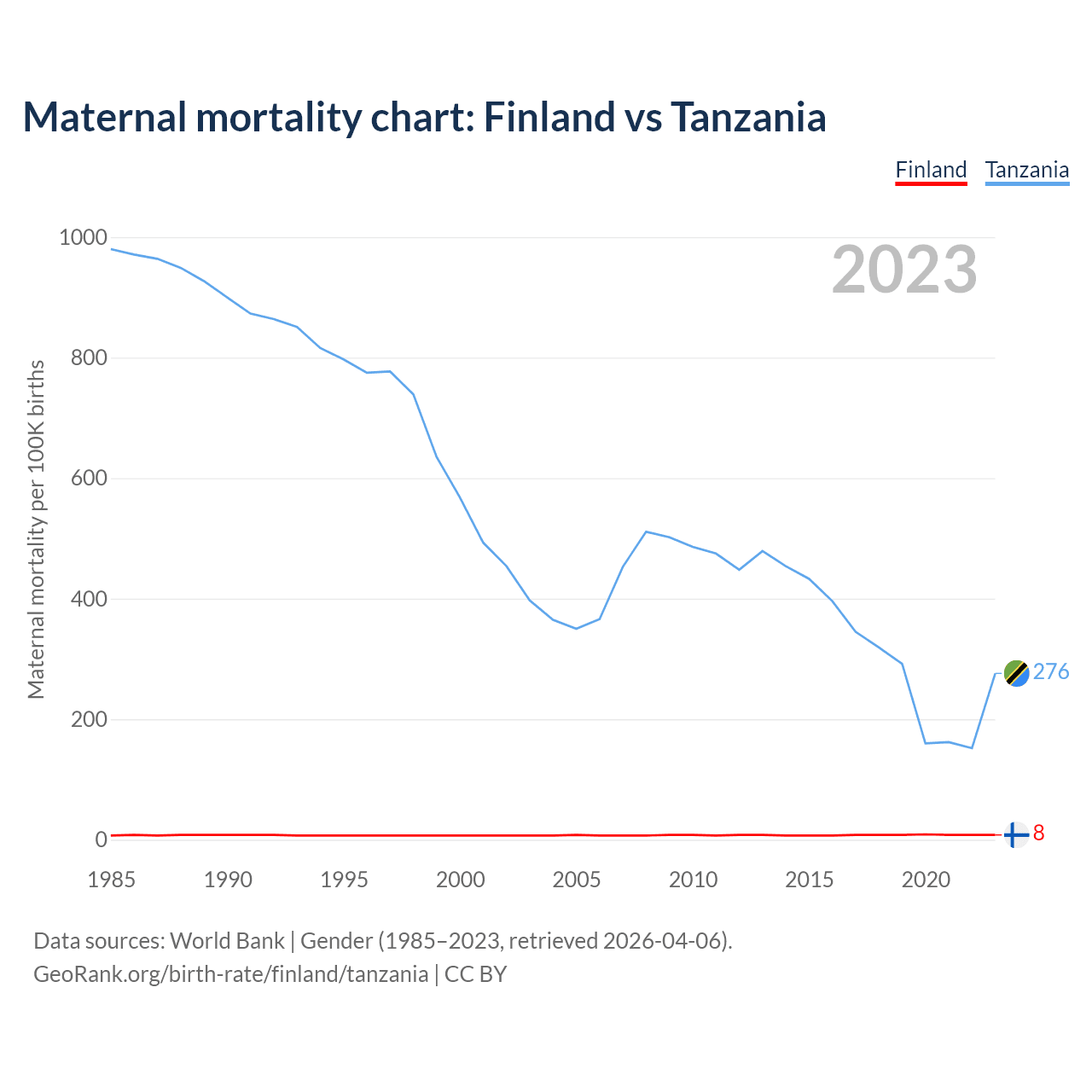 The maternal mortality rate, which is the probability of dying during childbirth or within 42 days of pregnancy termination, is 8 deaths per 100,000 live births in Finland, compared to 276 deaths in Tanzania.