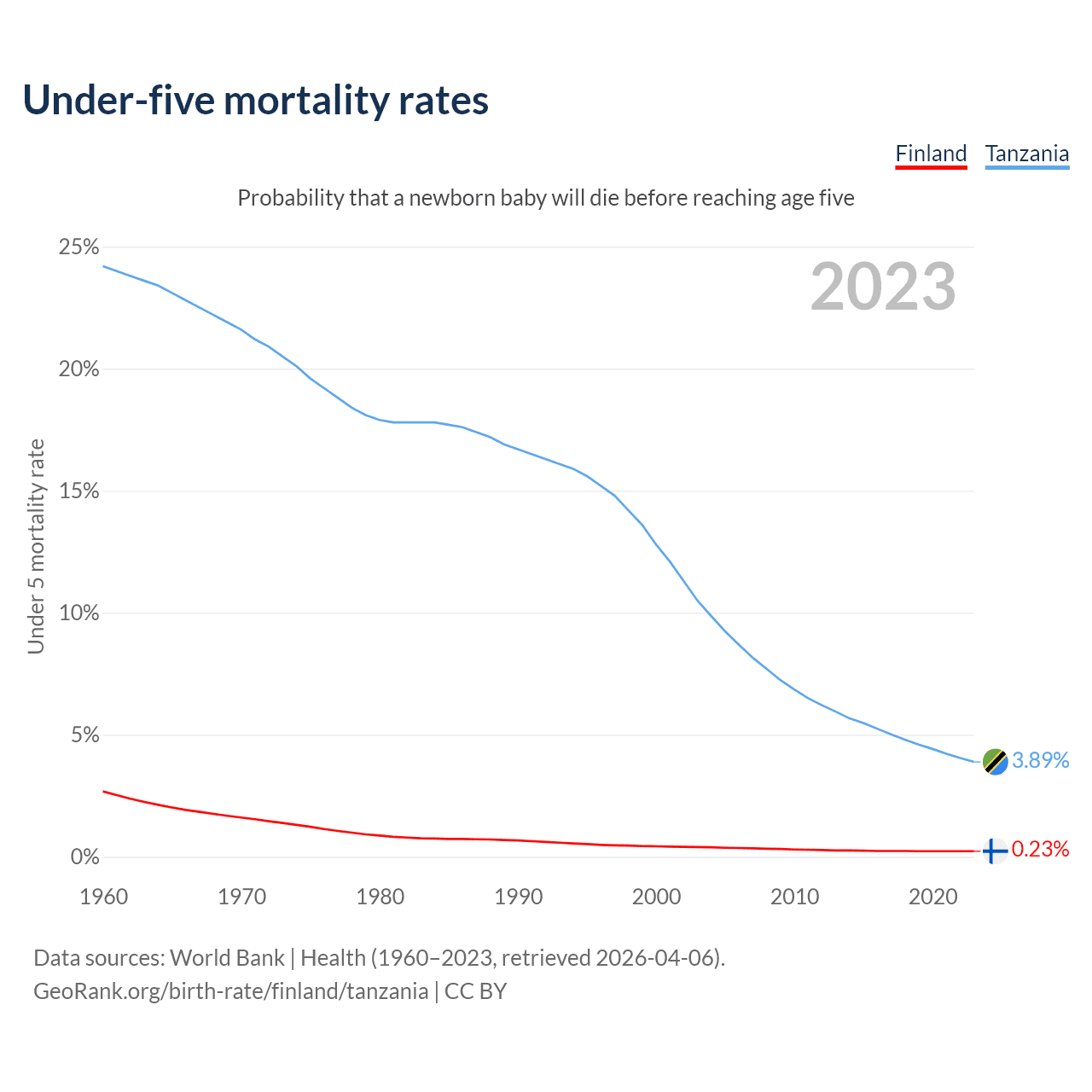 The chance that a newborn baby will die before reaching age five is 0.23% in Finland and 3.89% in Tanzania. Above is a chart with historical data on under-five mortality rates.