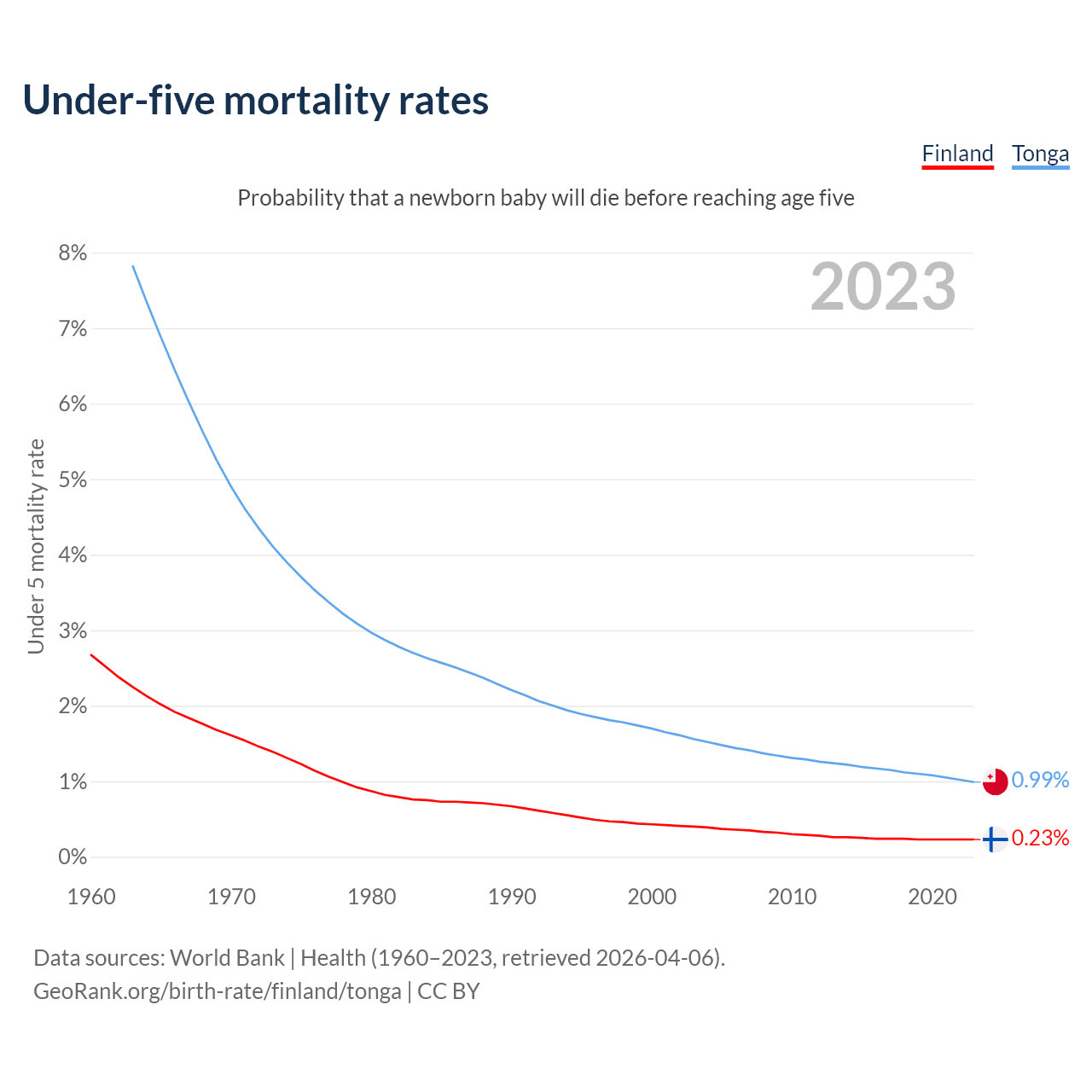The chance that a newborn baby will die before reaching age five is 0.23% in Finland and 0.99% in Tonga. Above is a chart with historical data on under-five mortality rates.
