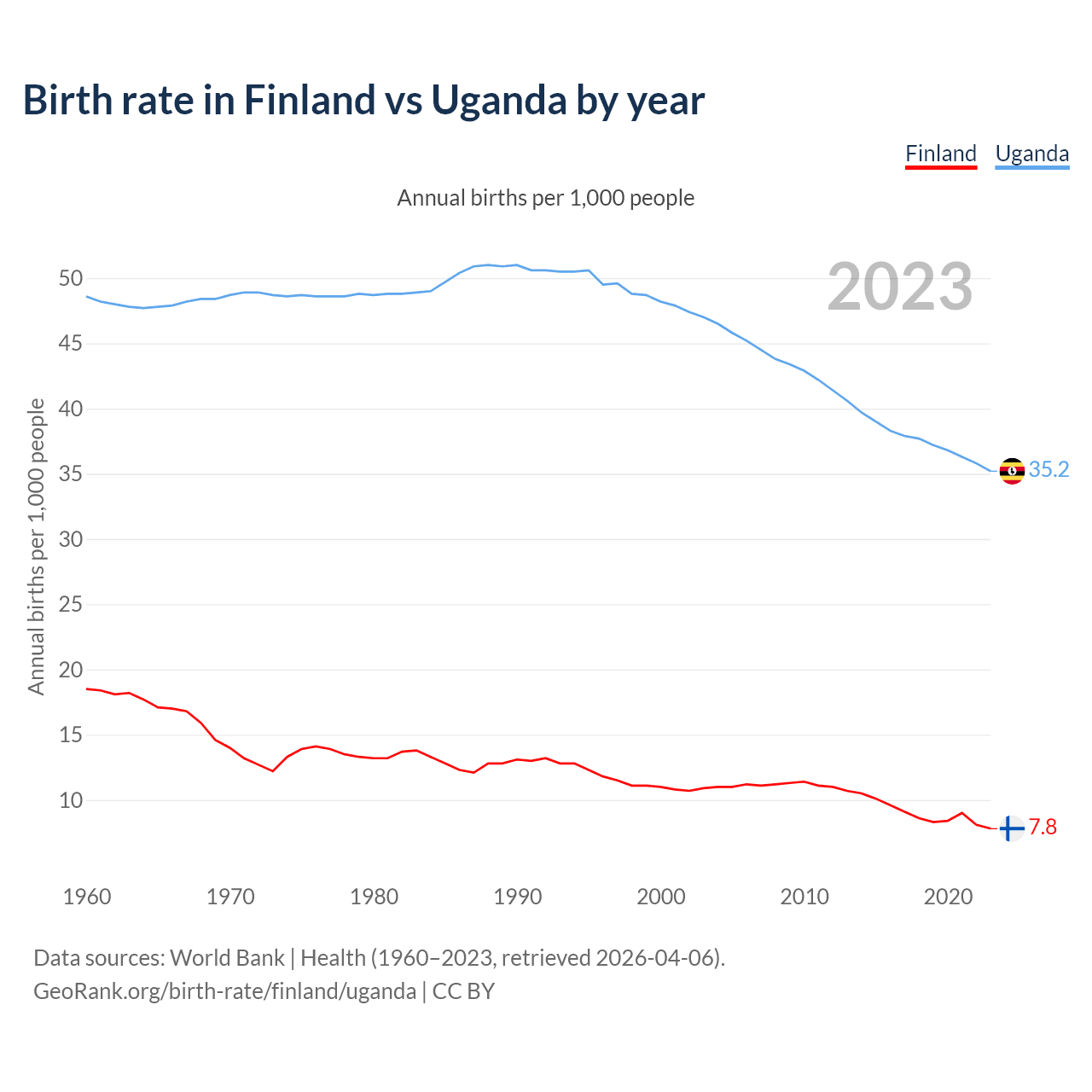 Finland has an annual birth rate of 7.8 births per 1,000 people, compared to 35.2 for Uganda. The average number of children a woman is expected to have during her lifetime — the fertility rate, is 1.26 in Finland and 4.28 in Uganda — 239.9% difference.