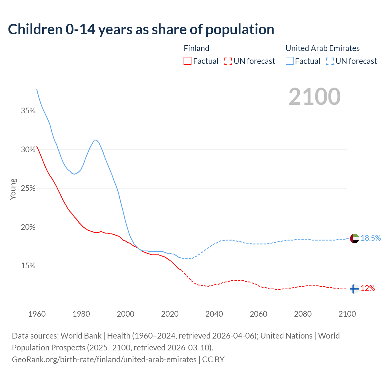 According to the latest available data on birth rates, the fertility rate in Finland was 1.26 children per woman in 2023, compared to 1.2 in the United Arab Emirates in 2023. The replacement level is considered to be 2.1 children per woman.