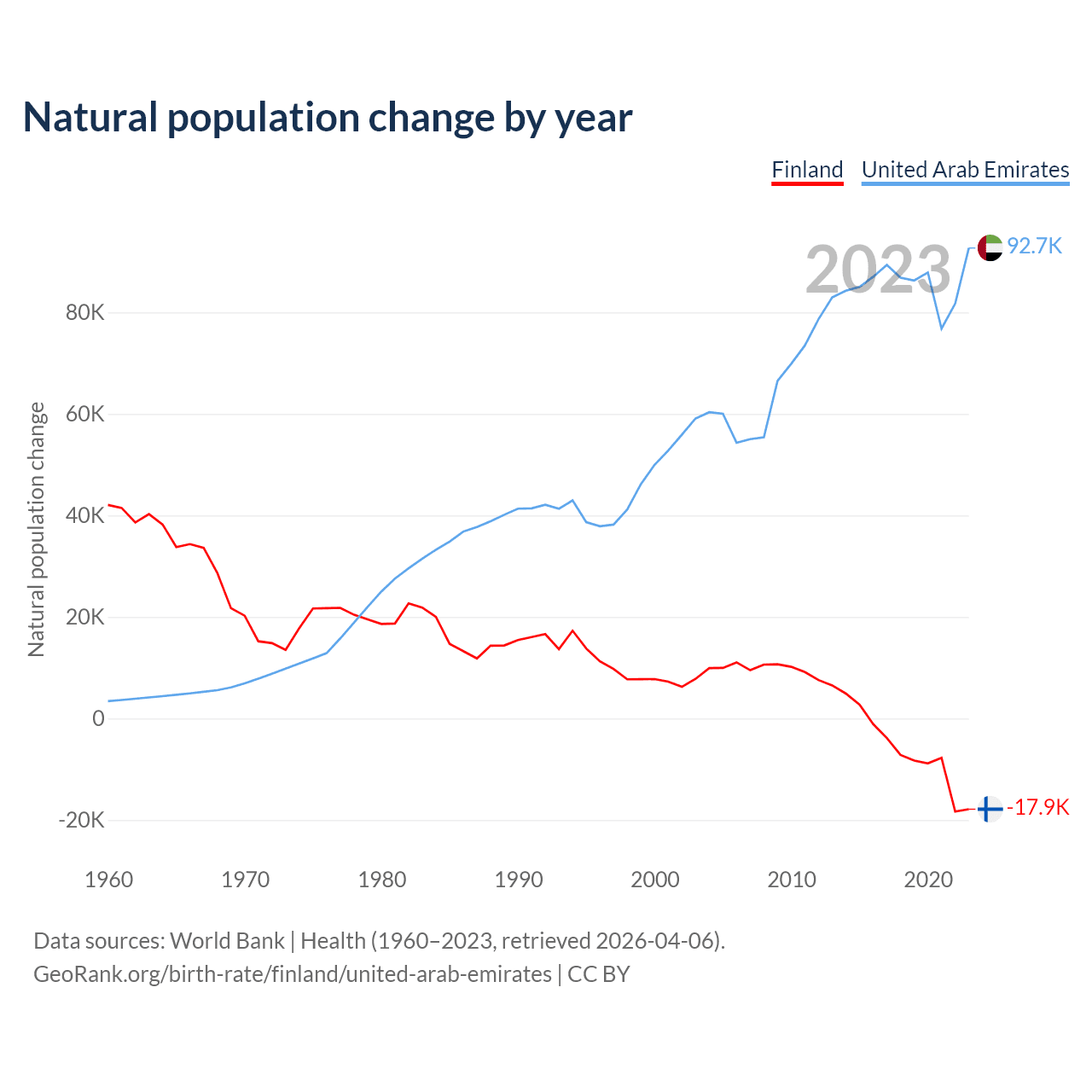 Finland has an annual birth rate of 7.8 births per 1,000 people, compared to 9.77 for the United Arab Emirates. The average number of children a woman is expected to have during her lifetime — the fertility rate, is 1.26 in Finland and 1.2 in the United Arab Emirates — 4.76% difference.