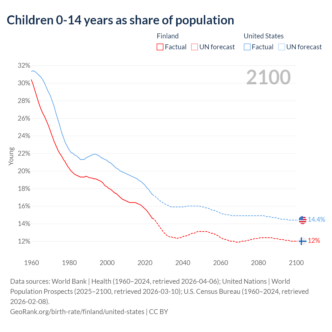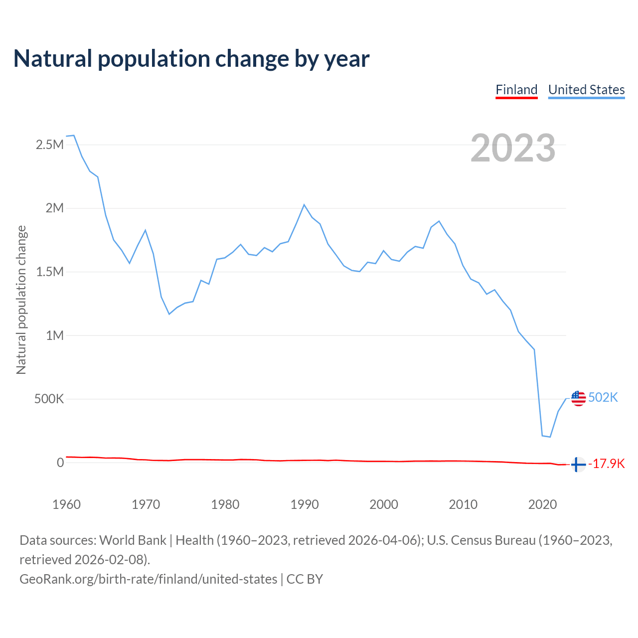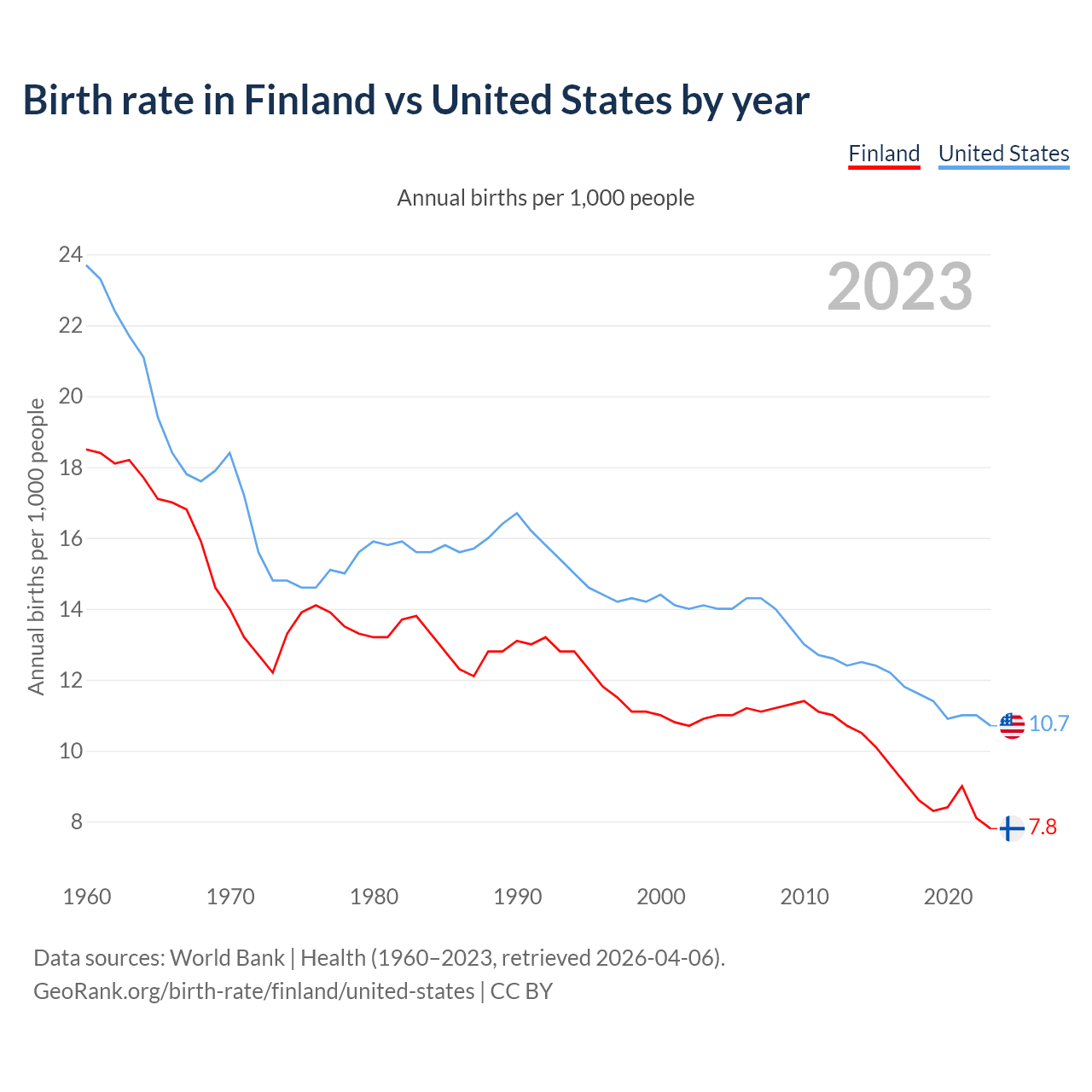 According to the latest available data on birth rates, the fertility rate in Finland was 1.26 children per woman in 2023, compared to 1.62 in the United States in 2023. The replacement level is considered to be 2.1 children per woman.