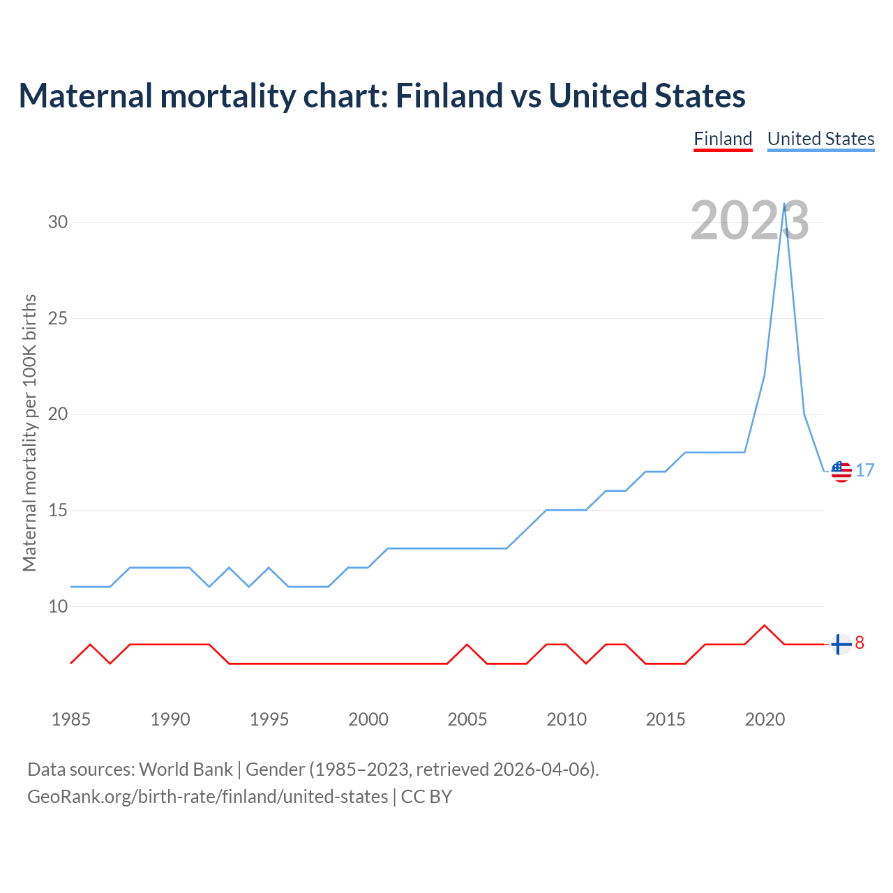 The maternal mortality rate, which is the probability of dying during childbirth or within 42 days of pregnancy termination, is 8 deaths per 100,000 live births in Finland, compared to 17 deaths in the United States.