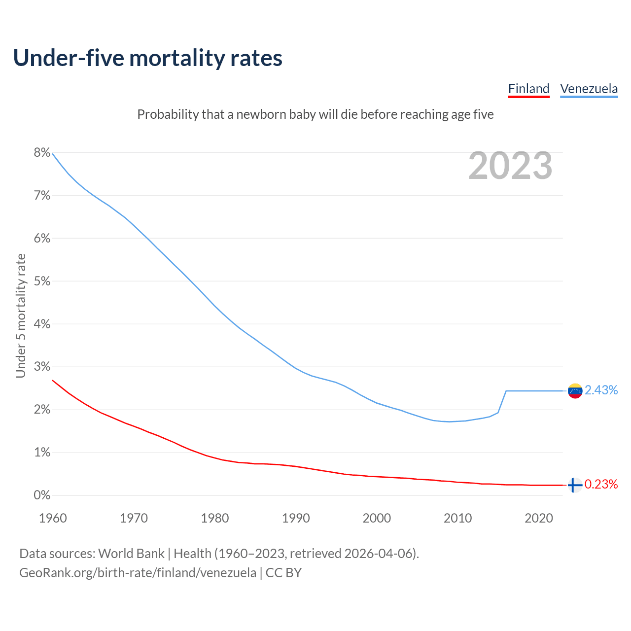 The chance that a newborn baby will die before reaching age five is 0.23% in Finland and 2.43% in Venezuela. Above is a chart with historical data on under-five mortality rates.