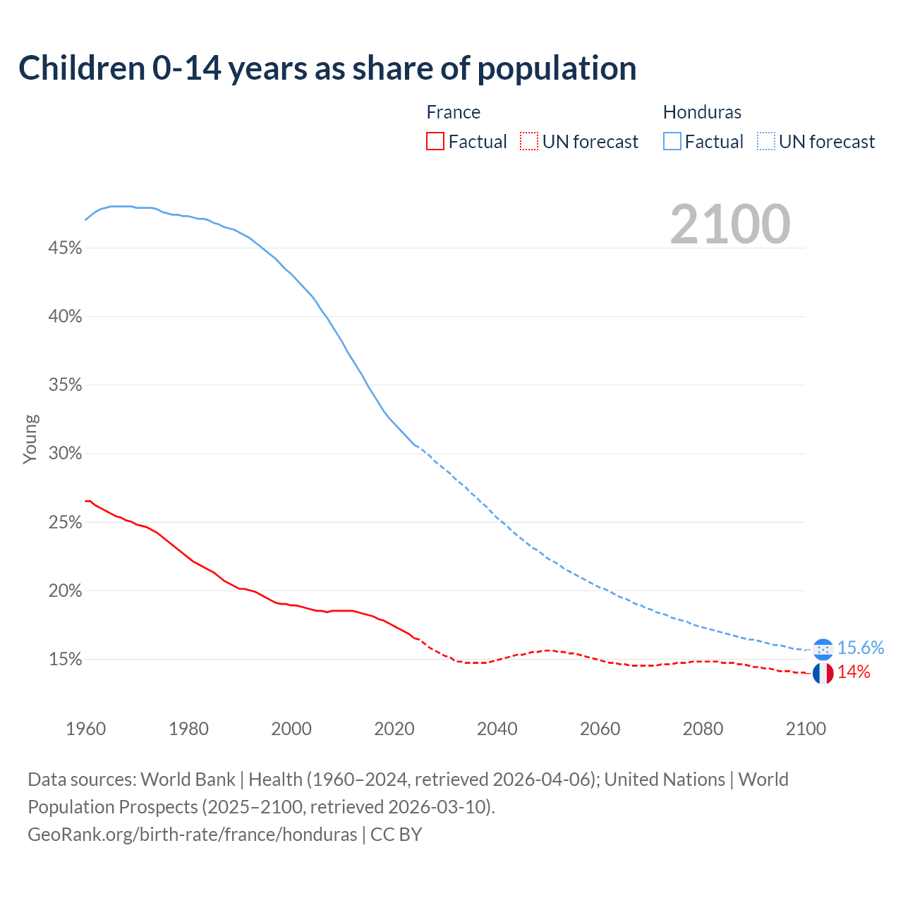 According to the latest available data on birth rates, the fertility rate in France was 1.66 children per woman in 2023, compared to 2.5 in Honduras in 2023. The replacement level is considered to be 2.1 children per woman.