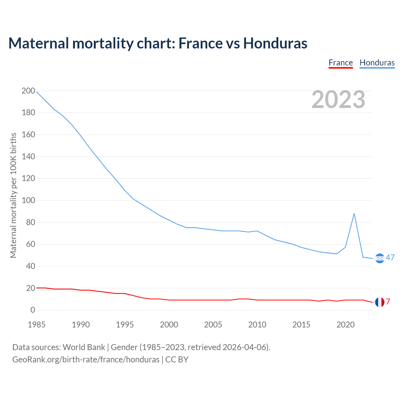 The maternal mortality rate, which is the probability of dying during childbirth or within 42 days of pregnancy termination, is 7 deaths per 100,000 live births in France, compared to 47 deaths in Honduras.