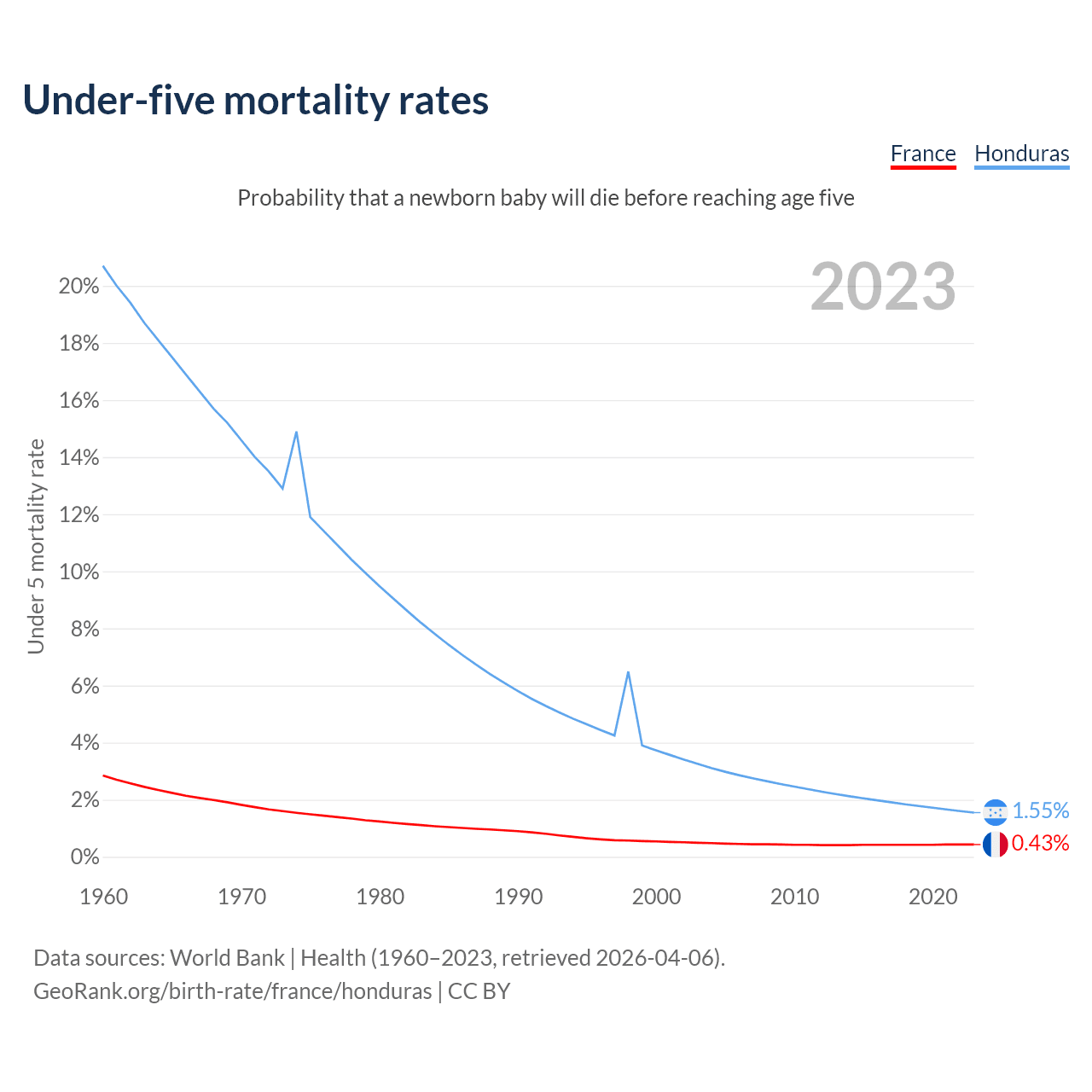 The chance that a newborn baby will die before reaching age five is 0.43% in France and 1.55% in Honduras. Above is a chart with historical data on under-five mortality rates.