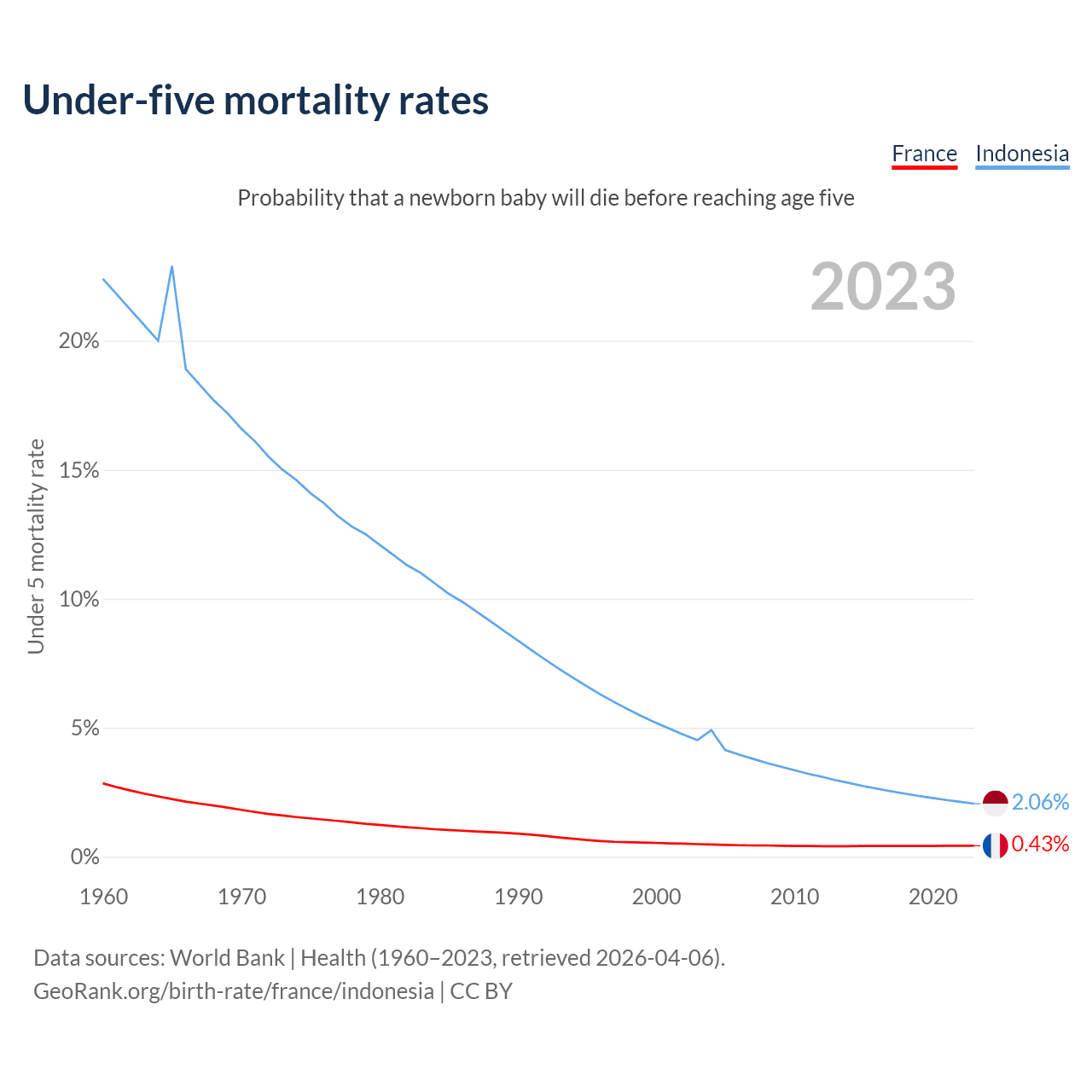 The chance that a newborn baby will die before reaching age five is 0.43% in France and 2.06% in Indonesia. Above is a chart with historical data on under-five mortality rates.