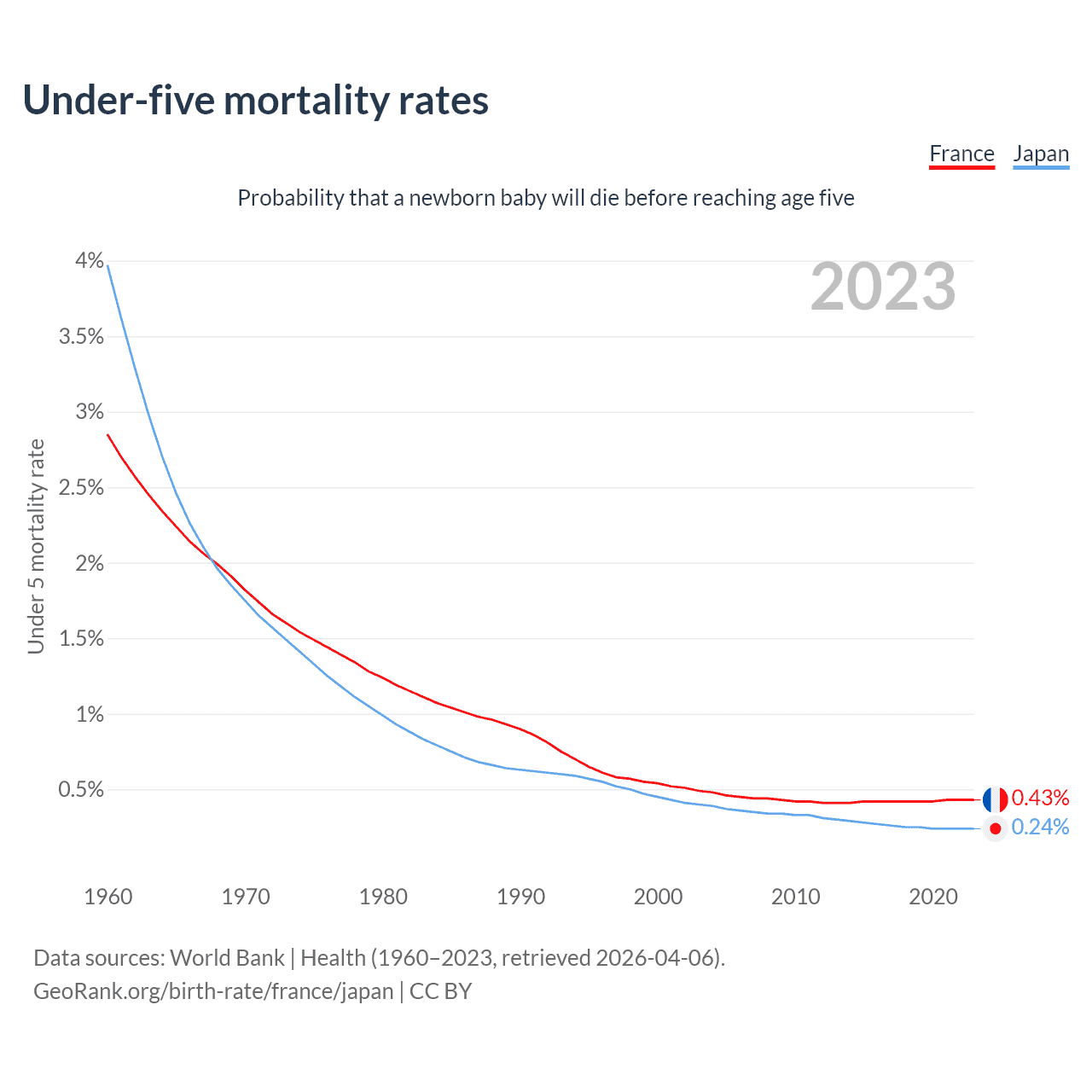 The chance that a newborn baby will die before reaching age five is 0.43% in France and 0.24% in Japan. Above is a chart with historical data on under-five mortality rates.