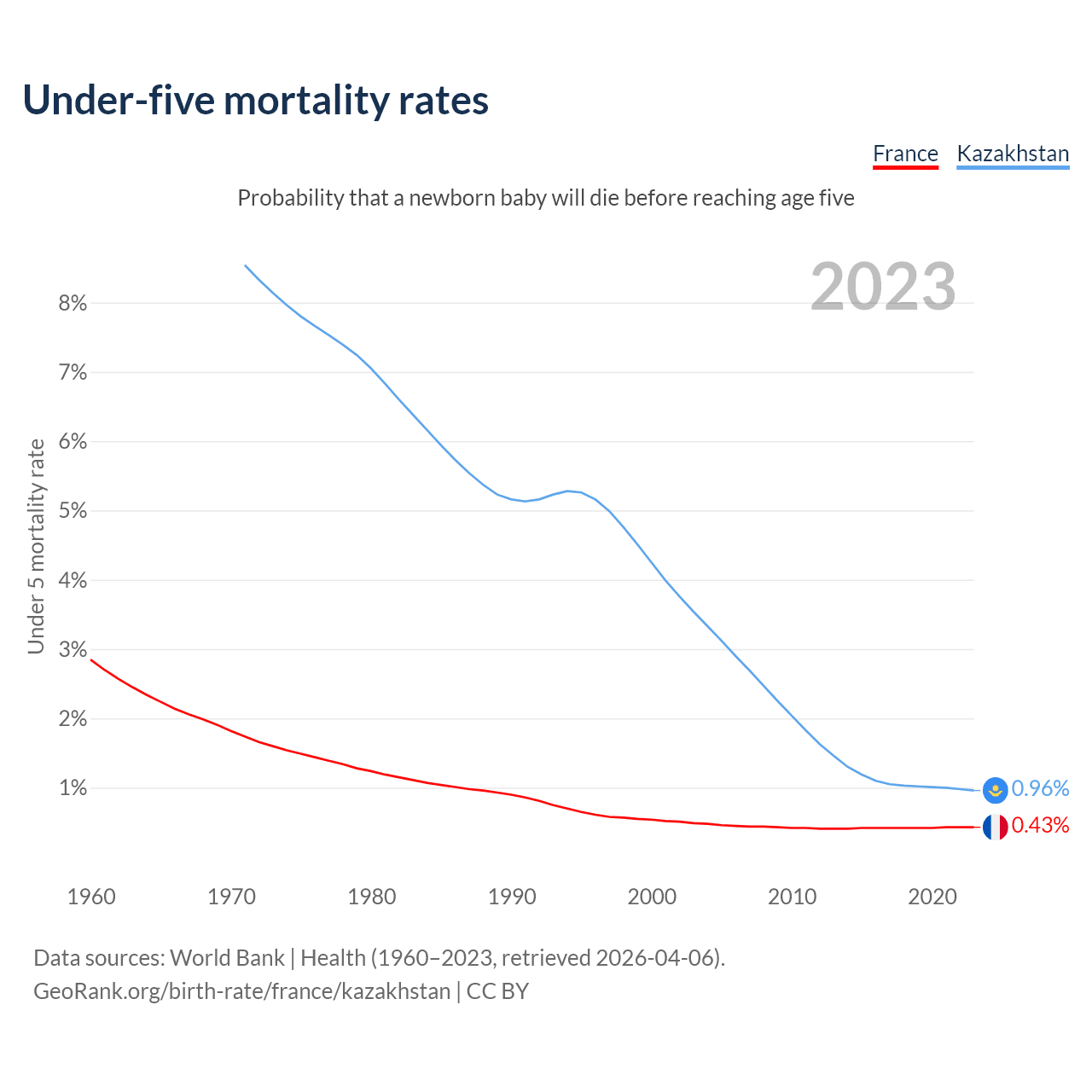 The chance that a newborn baby will die before reaching age five is 0.43% in France and 0.96% in Kazakhstan. Above is a chart with historical data on under-five mortality rates.